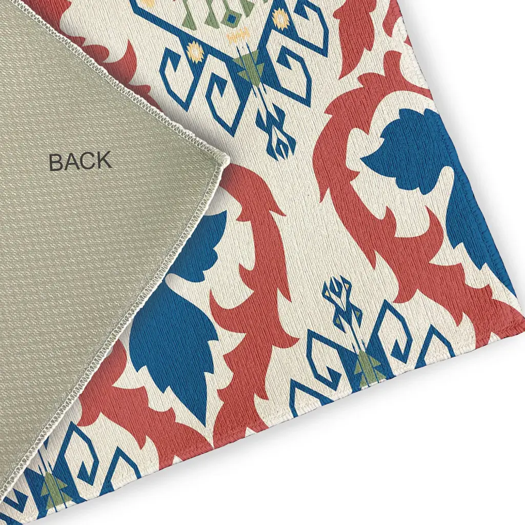 Create a colorful and radiant vibe around your home with the Bombay Indoor/outdoor Rug from our Happy Hippy Collection. Everyone will delight in the space defining design brought to your porch, patio, kitchen, or bathroom by this area rug. The artistic and colorful design is printed on a soft polyester base with a skid resistant backing, making it a perfect way to add color, flare and personality to any indoor or outdoor space. To clean, use a mild soap and lay flat to dry.