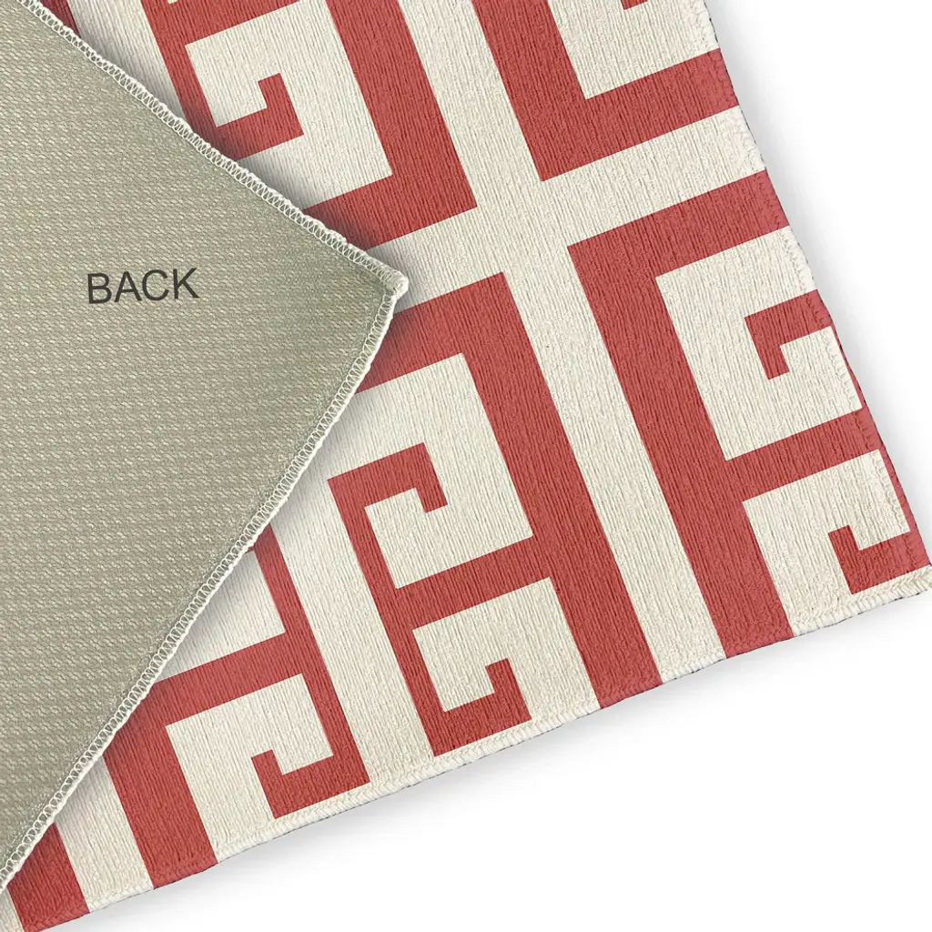 Complete your look with a Greek Key Patterned Indoor/outdoor Rug from our Subline Collection. Everyone will delight in the space defining design brought to your porch, patio, kitchen, or bathroom by this area rug. The artistic and colorful design is printed on a soft polyester base with a skid resistant backing, making it a perfect way to add color, flare and personality to any indoor or outdoor space. To clean, use a mild soap and lay flat to dry.Soft underfoot, made of textured ChenilleStylish and functional to enliven your outdoor d?corSerged edgesCoated skid-resistant backingQuick-dry constructionStiff, lay-flat design