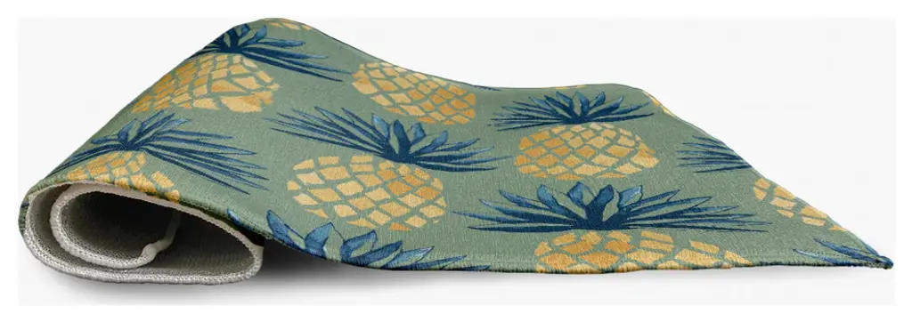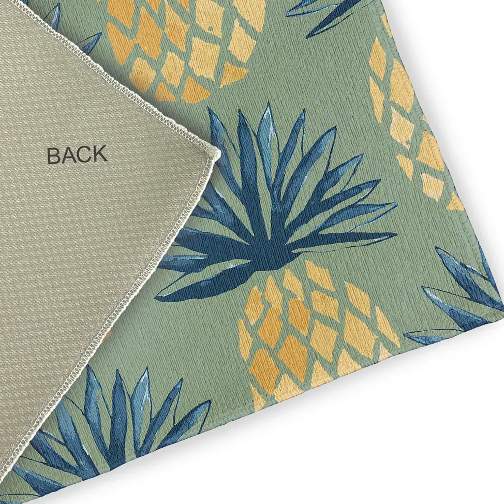 Create a lively tropical spirit and an inviting breezy atmosphere in your home with a Pineapple Stripes Indoor/outdoor Rug from our Tropical Resort Collection. Everyone will delight in the space defining design brought to your porch, patio, kitchen, or bathroom by this area rug. The artistic and colorful design is printed on a soft polyester base with a skid resistant backing, making it a perfect way to add color, flare and personality to any indoor or outdoor space. To clean, use a mild soap and lay flat to dry.Soft underfoot, made of textured ChenilleStylish and functional to enliven your outdoor d?corSerged edgesCoated skid-resistant backingQuick-dry constructionStiff, lay-flat design