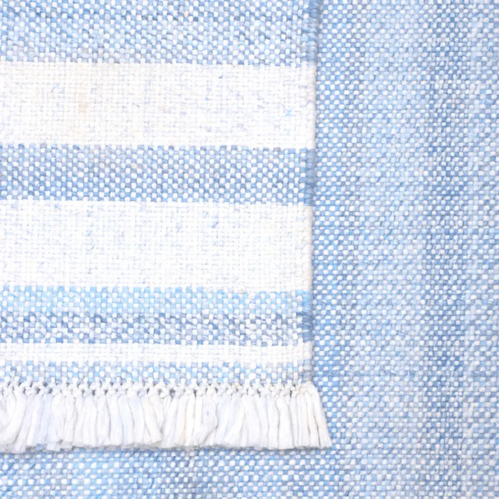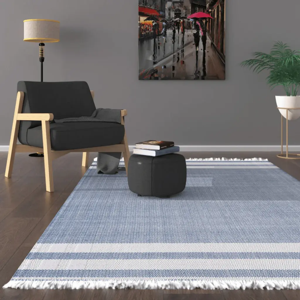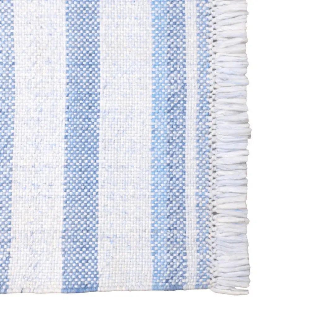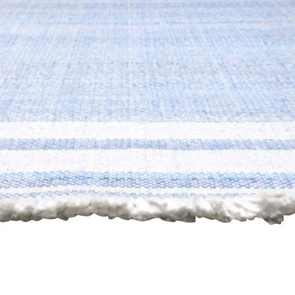 Add great coloration and comfortable texture to your space with this 5-foot x 7-foot blue striped handmade stain resistant non skid indoor outdoor area rug. This rectangle shaped rug features a striped design in blue to give it visual interest. A classic shape marries with good looking design for your space Ideal for spaces with kids and pets, this rug is stain resistant to help repel stains and spilled liquids. Place this area rug against a hardwood or tile floor and it will enliven your living space with style and sophistication. 0.27-inch H x 93-inch W x 60-inch D