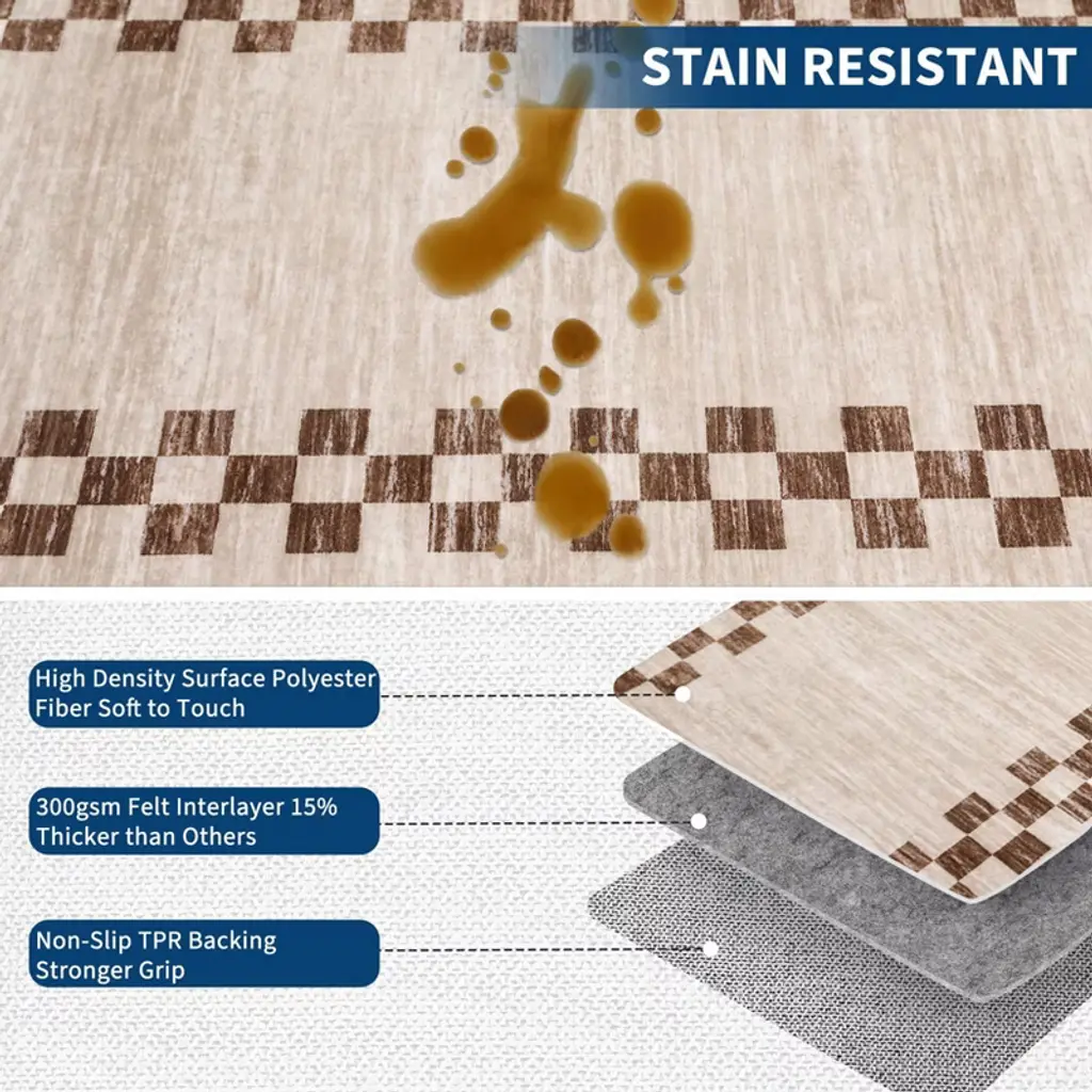 With non slip backing, safe for families and pets, ensuring a friendly environment for all.This carpet is designed with an elegant and intricate border pattern framing the edges, adding a refined and finished look to the overall design.This washable rug features a stain resistant, high durability construction - making it perfect for high traffic areas.The low pile provides a flat and even surface that is both easy to maintain and perfect for high-traffic areas, while still maintaining a soft and comfortable feel underfoot.Effortlessly preserved through simple care methods like hosing or machine washing, spot cleaning with a gentle detergent, and routine vacuuming to ensure it stays pristine and vibrant.