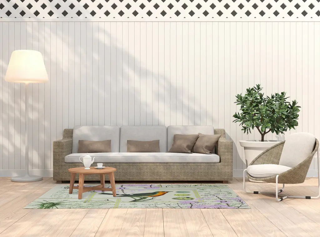 Enjoy a new style this season with a Singing Bird Indoor/outdoor Rug from our Funky Junky Collection. Everyone will delight in the space defining design brought to your porch, patio, kitchen, or bathroom by this area rug. The artistic and colorful design is printed on a soft polyester base with a skid resistant backing, making it a perfect way to add color, flare and personality to any indoor or outdoor space. To clean, use a mild soap and lay flat to dry.