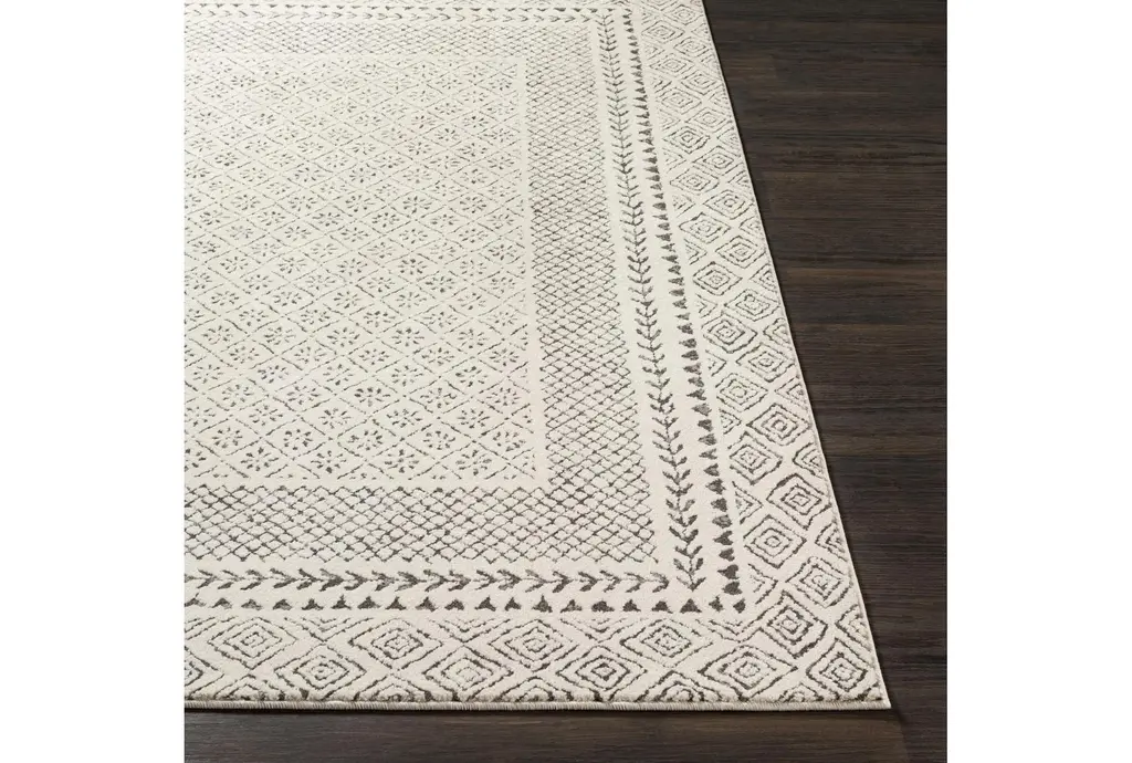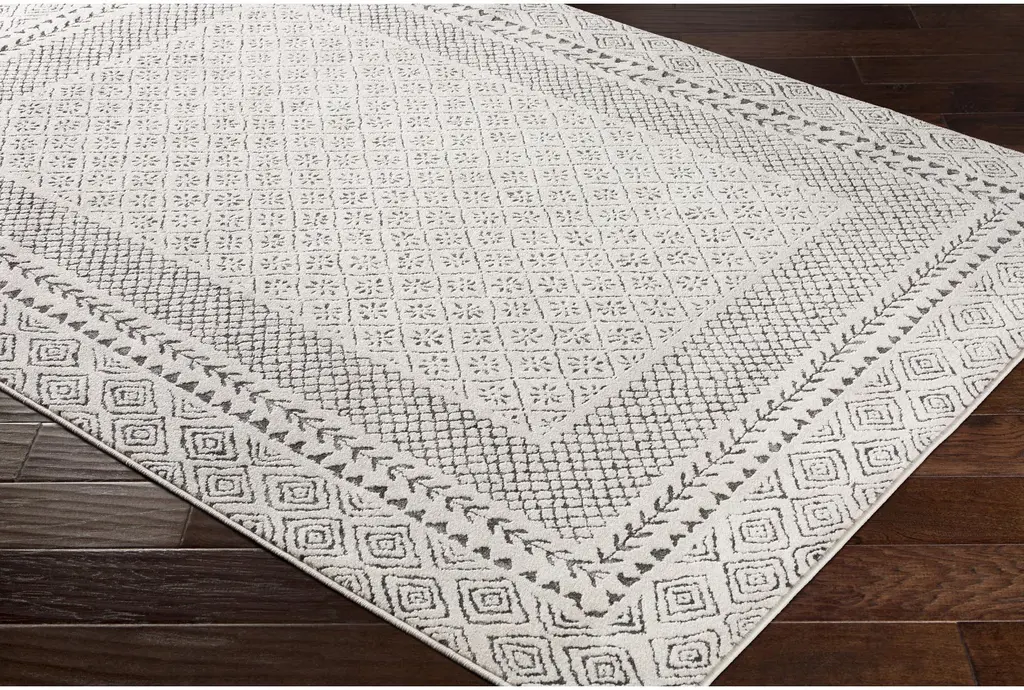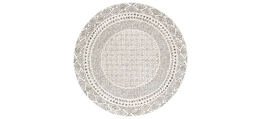 Add a touch of modern flair to your indoor spaces with the 5'3" Round Fiber Rug-Global Geometric Low/High Grey Beige by Surya. This rug features a captivating geometric design in soothing shades of medium grey, beige, and charcoal. The low pile height ensures easy maintenance and durability, making it perfect for high-traffic areas like entryways and living rooms.