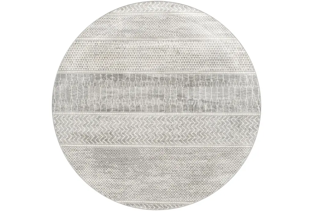 Enhance your living space with the 5'3" Round Fiber Rug-Modern Triangle Greys And White by Surya. This modern, low pile rug features a striking geometric design in various shades of grey and white, making it a versatile addition to any room in your home. Made from 100% polypropylene, this durable rug is perfect for high-traffic areas like the dining room, living room, or any indoor space.