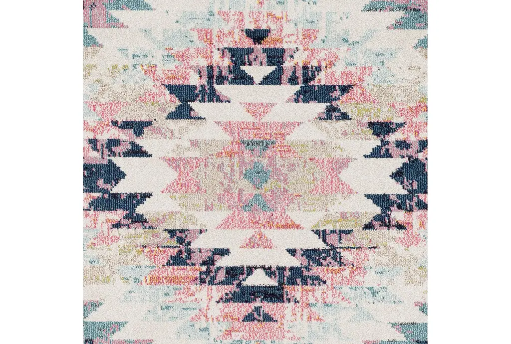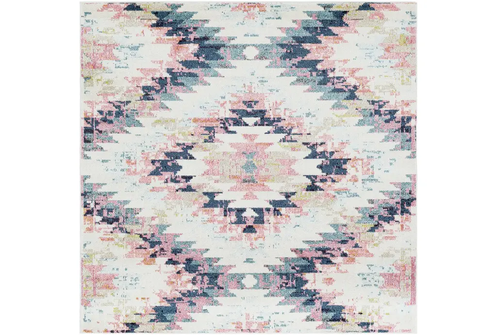 5'3" Round Fiber Rug-White & Blue Geo Pattern | Low Pile | Geometric By Surya