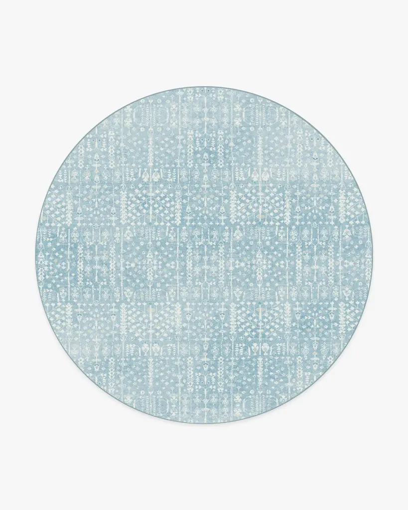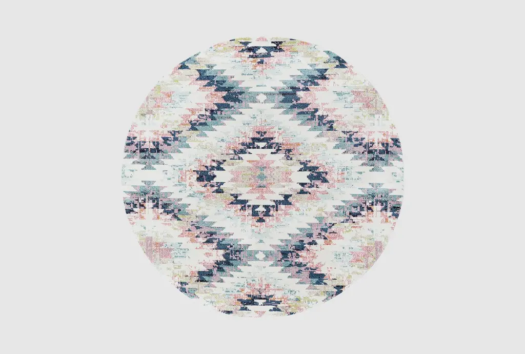 Enhance the aesthetic of your office with our modern 5'3" round rug featuring a beautiful white and blue geo pattern and made from high-quality fiber with a low pile. Perfect for indoor use, this rug will add a touch of elegance to any room.