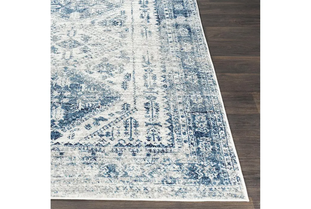 This 5'3" round rug boasts a traditional blue design and is made of durable fiber with a low pile, making it perfect for indoor use. Enhance the style of your living room or dining room with this timeless piece.