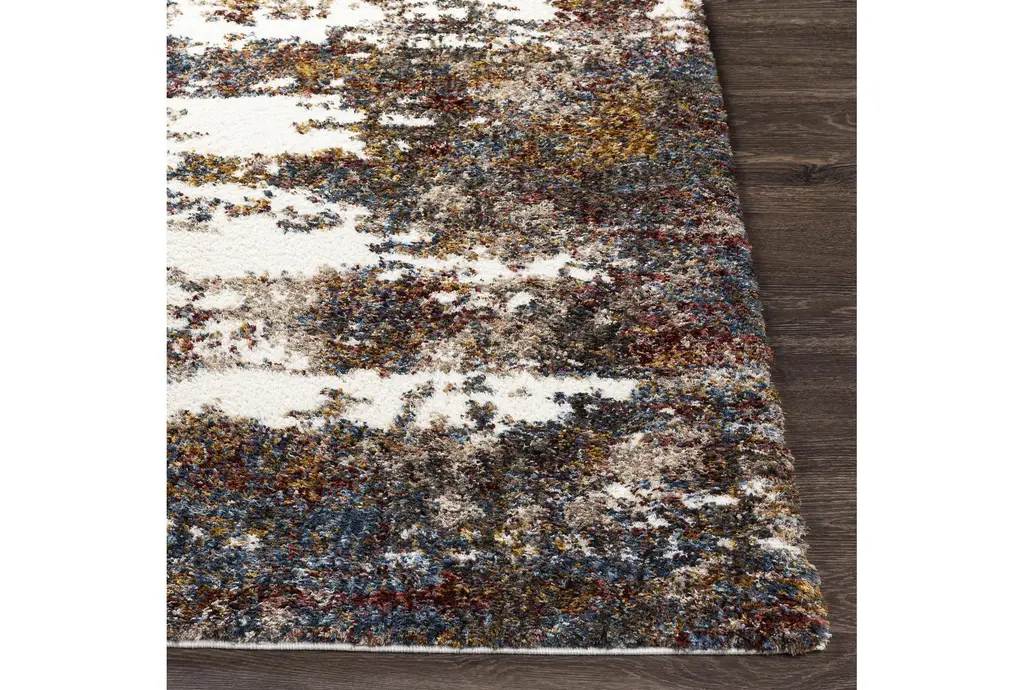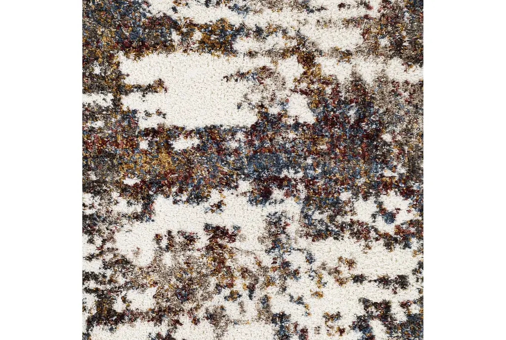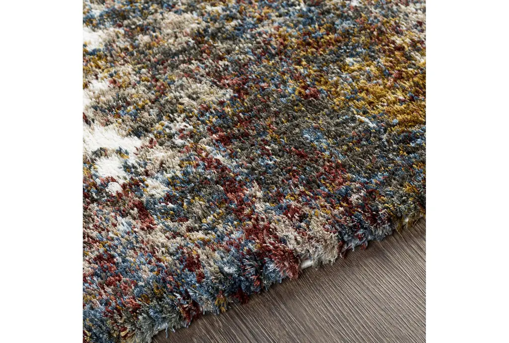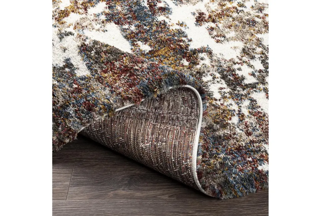Enhance your living space with the 5'3"X7' Fabric Rug-Anais Abstract Shag in Bronze/Multi by Surya. This modern rug features a stunning abstract design that incorporates a variety of colors, including teal, dark blue, denim, burgundy, rose, sage, dark green, mustard, and cream. The shag texture adds a cozy and inviting feel to any room.