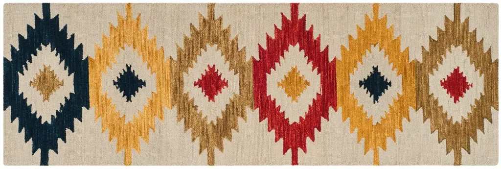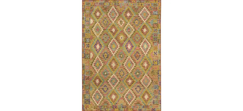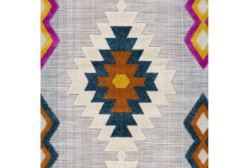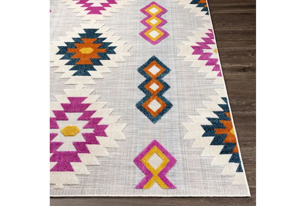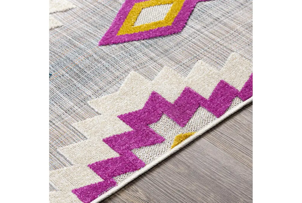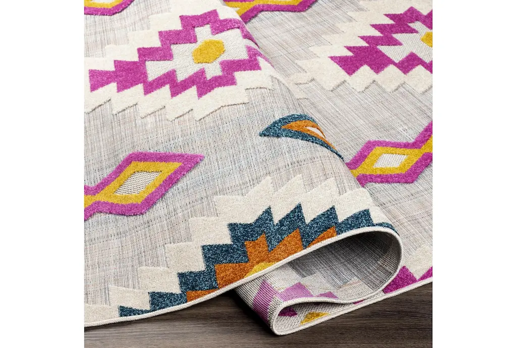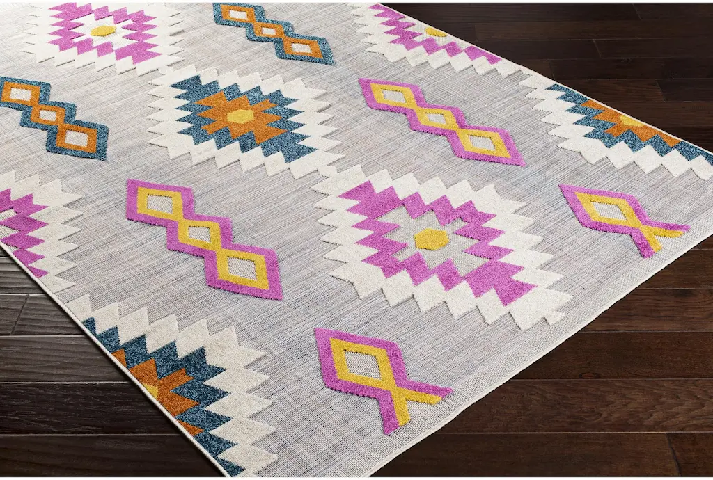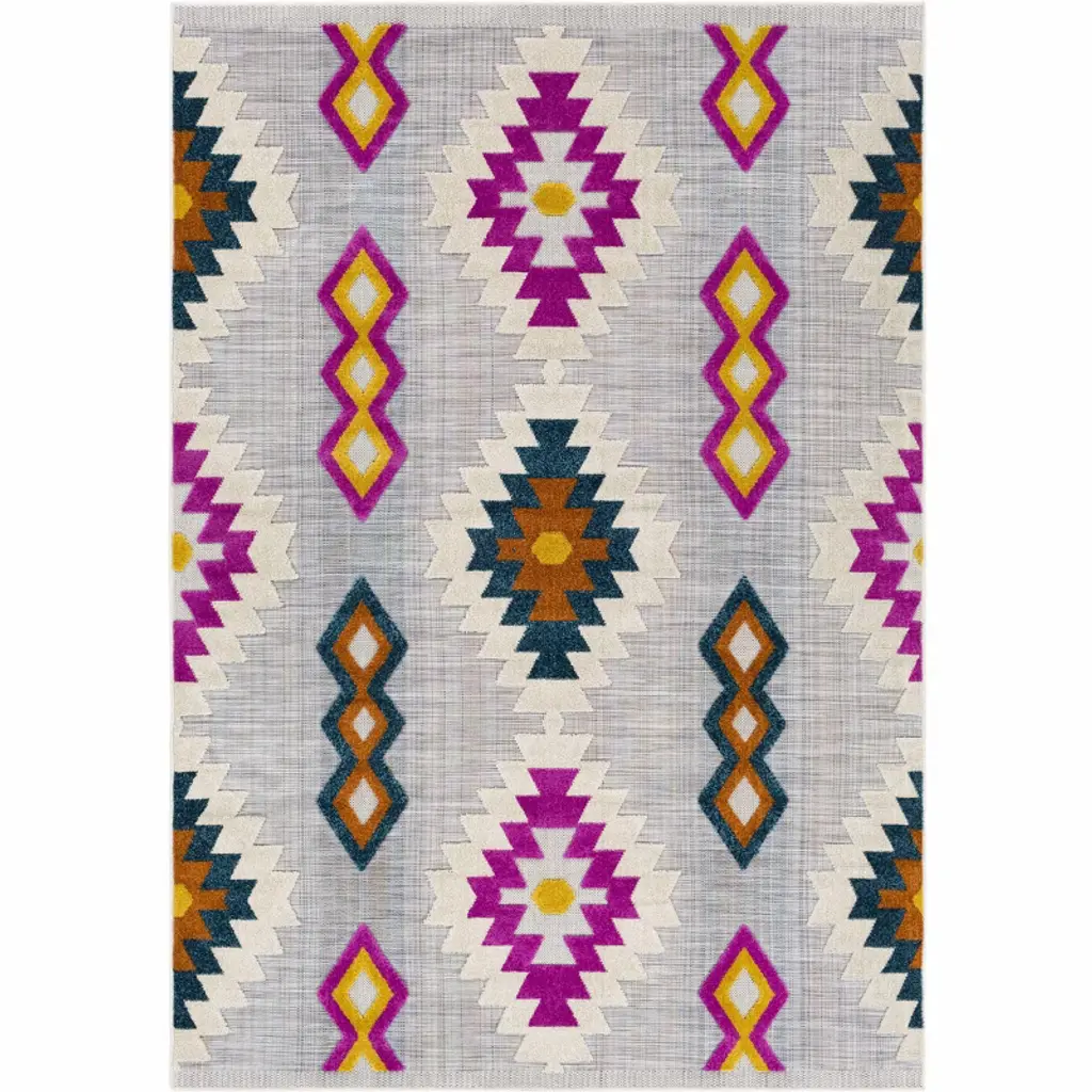 Elevate your living space with the 5'3"X7' Rectangle Indoor/Outdoor Fiber Rug Multicolored Geometric Streamlined Diamonds by Surya. This modern rug features a vibrant geometric pattern in navy, burnt orange, bright pink, bright yellow, cream, and taupe, making it a bold addition to any room. Durable and versatile, it's perfect for both indoor and outdoor use, bringing color and style to your living room or patio.