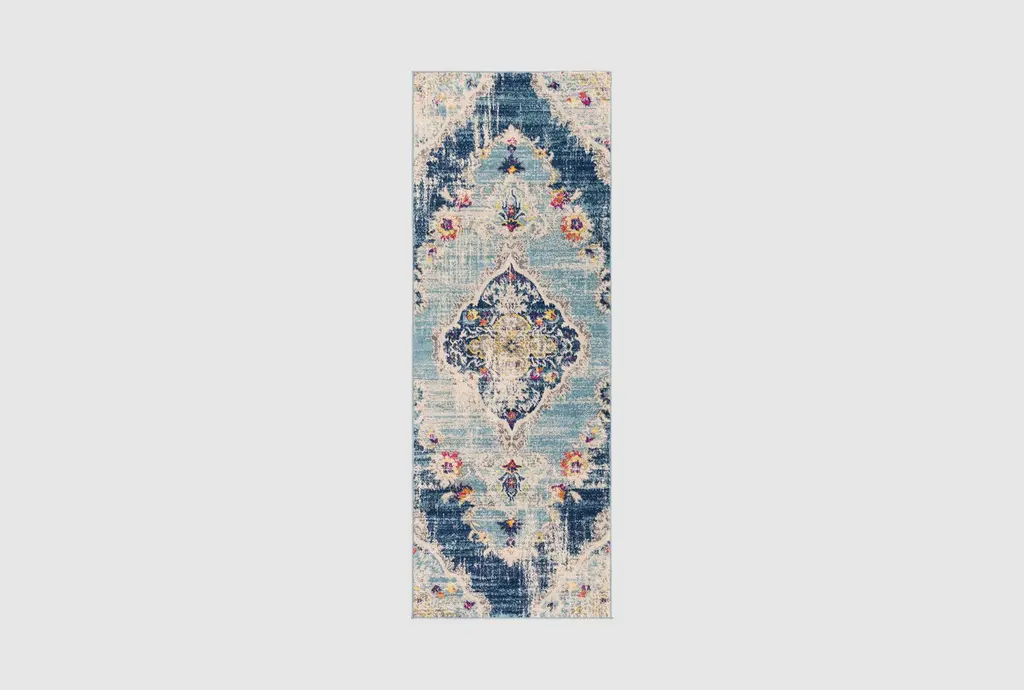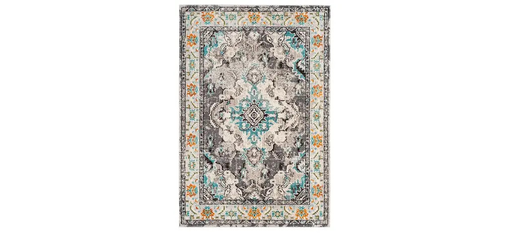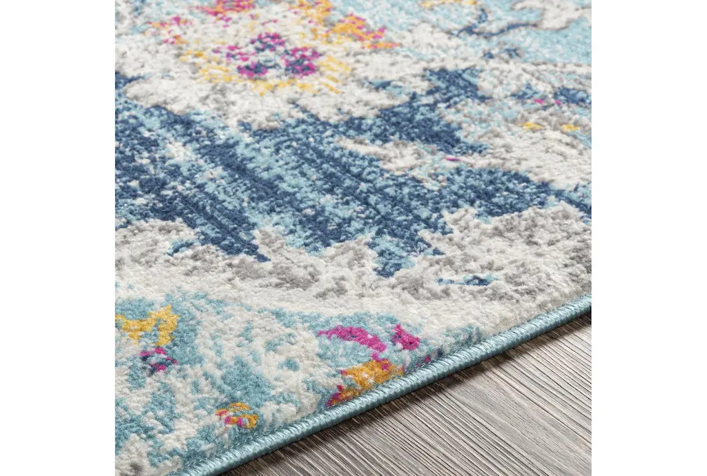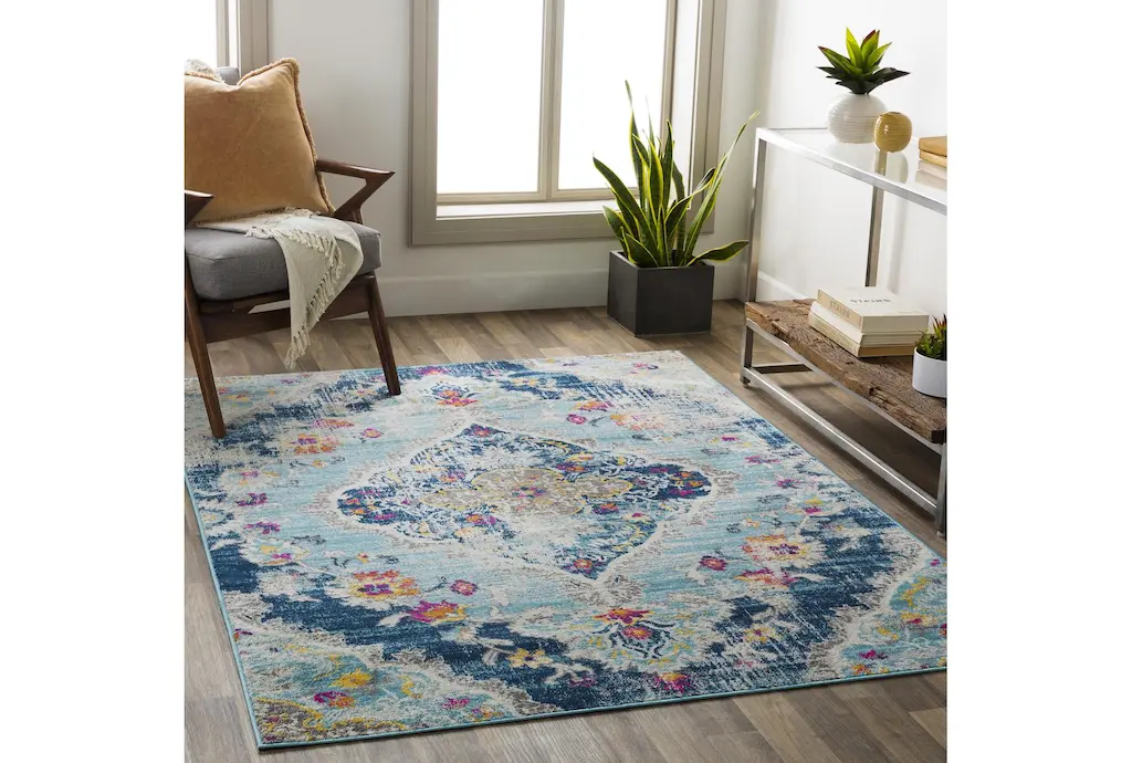 Bring a touch of modern flair to your indoor living space with this stunning 5'3" x 7' rectangle rug by Surya. The sky blue color palette beautifully blends with navy, beige, medium grey, bright pink, saffron, burnt orange, and silver grey, creating a vibrant and eye-catching design. Made with 100% polypropylene, this low pile rug ensures durability and comfort for your home.