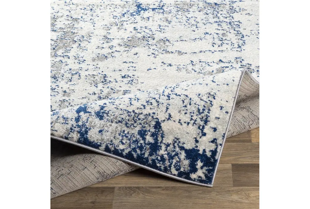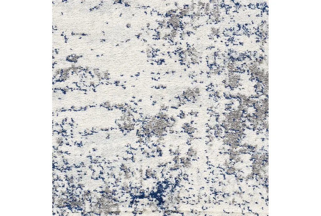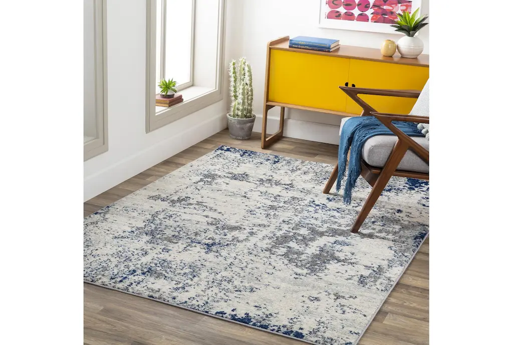 This stunning 5'3" x 7'1" rug offers a contemporary touch to any living space with its modern abstract design. The blend of medium grey, white, and dark blue adds a sophisticated flair that complements various interior styles. Made from 100% polypropylene, this low pile rug is both durable and easy to maintain.