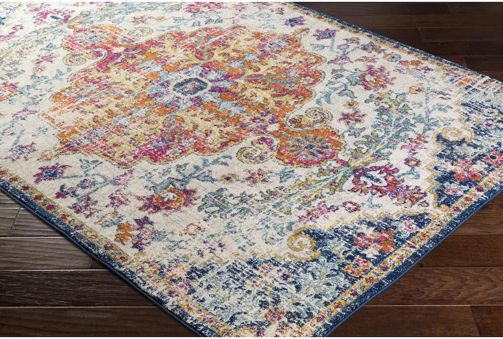 Enhance your living space with the vibrant and colorful 5'3"x7'3" Fiber Rug featuring the Ivete Medallion Traditional Botanical design by Surya. This stunning area rug is a perfect addition to any room with its intricate medallion and floral motifs in a beautiful blend of ivory, blue, orange, tan, pink, violet, and yellow colors. Made from 100% polypropylene, this low pile rug is both durable and easy to maintain.