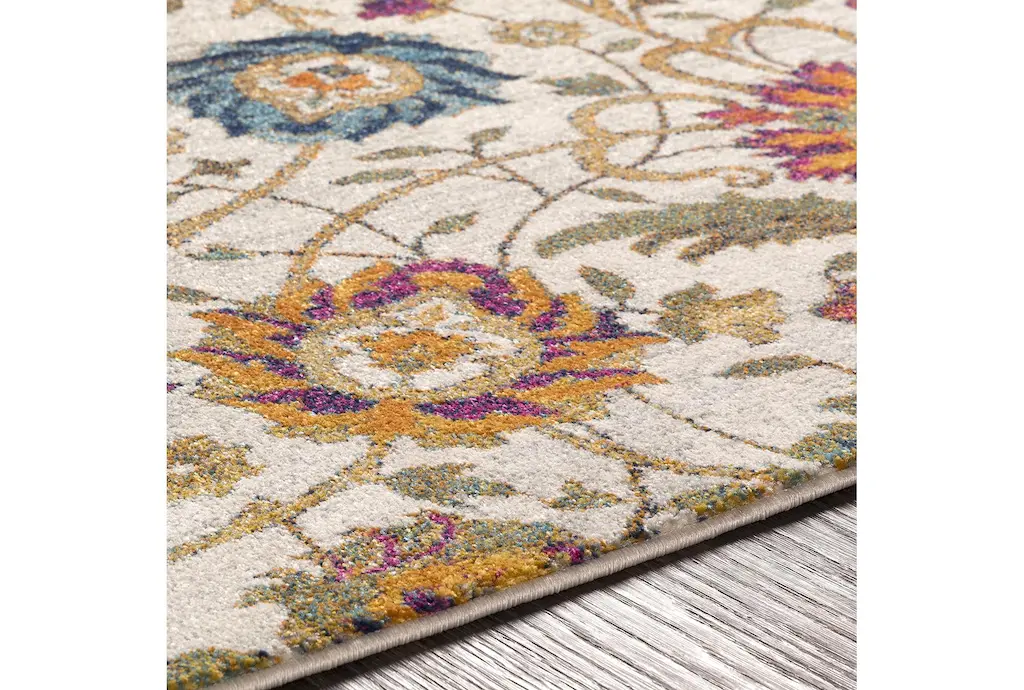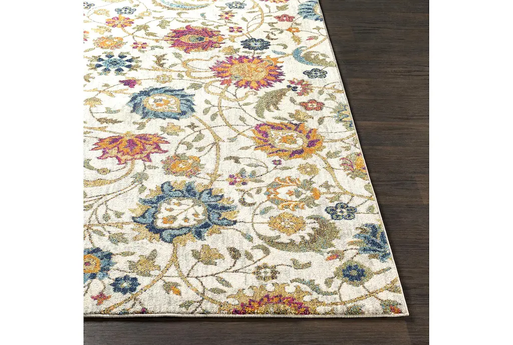 Enhance your living room with the vibrant and stylish 5'3"x7'3" Fiber Rug by Surya. Featuring a modern botanical design, this low pile rectangular rug brings a burst of color and comfort to any indoor space. The combination of saffron, teal, light grey, beige, dark blue, garnet, burnt orange, and black creates a stunning visual impact.