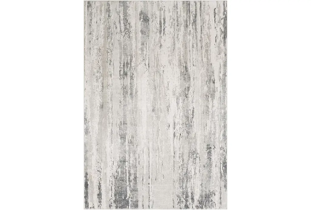 Enhance your living space with the 5'3" x 7'3" Fiber Rug in Shades of Grey Waterfall. This modern, low pile rug features a beautiful gradient design in medium grey, charcoal, light grey, and white. Perfect for indoor use, it adds a touch of sophistication to any room.