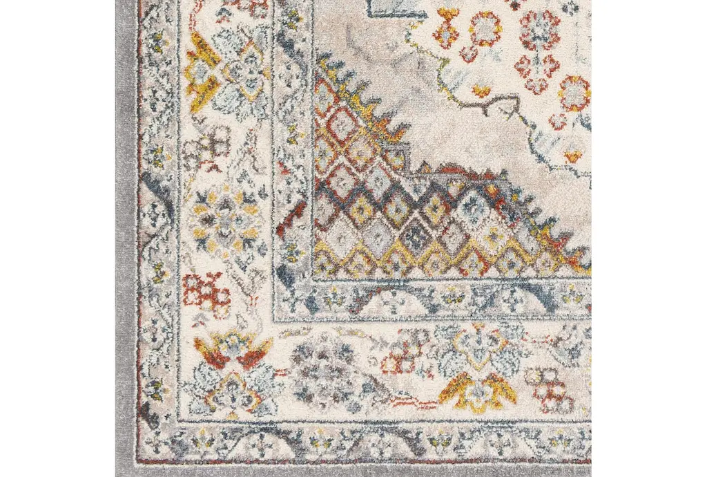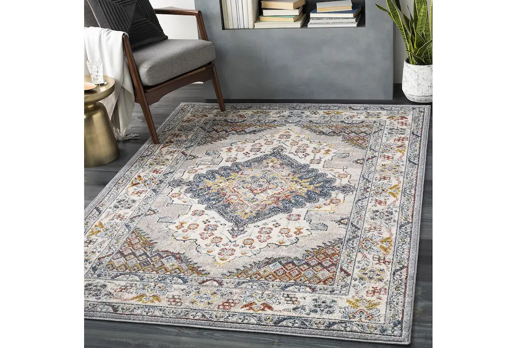 Enhance your living room with the 5'3"x7'3" Fiber Rug by Surya. This traditional botanical rug features a vibrant medallion design with a harmonious blend of medium grey, taupe, pale blue, teal, cream, burnt orange, lime, and charcoal. Crafted from 100% polypropylene, it offers durability and a soft touch underfoot.
