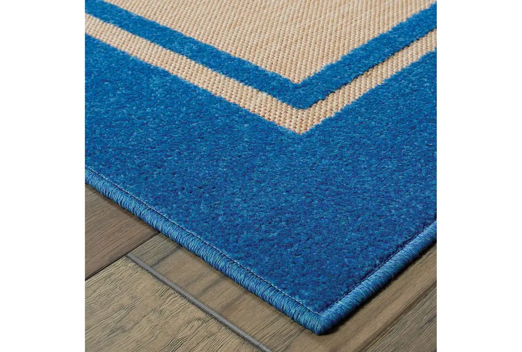 Enhance your living space with the 5'3"X7'5" Fiber Indoor/Outdoor Rug in Blue Double Border. This contemporary rectangle rug features a sand and blue color scheme, perfect for adding a touch of modern style to any room. Made from durable polypropylene, it is suitable for both indoor and outdoor use.