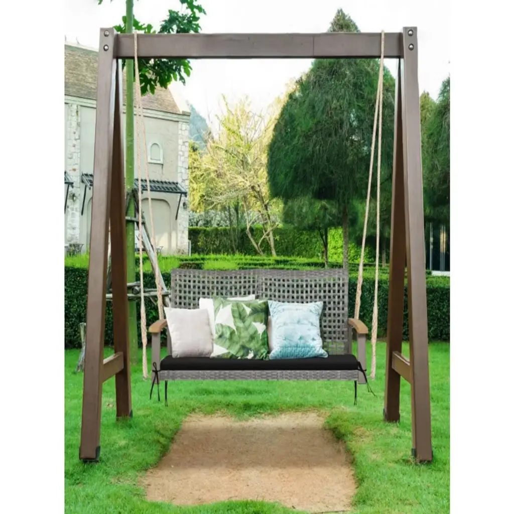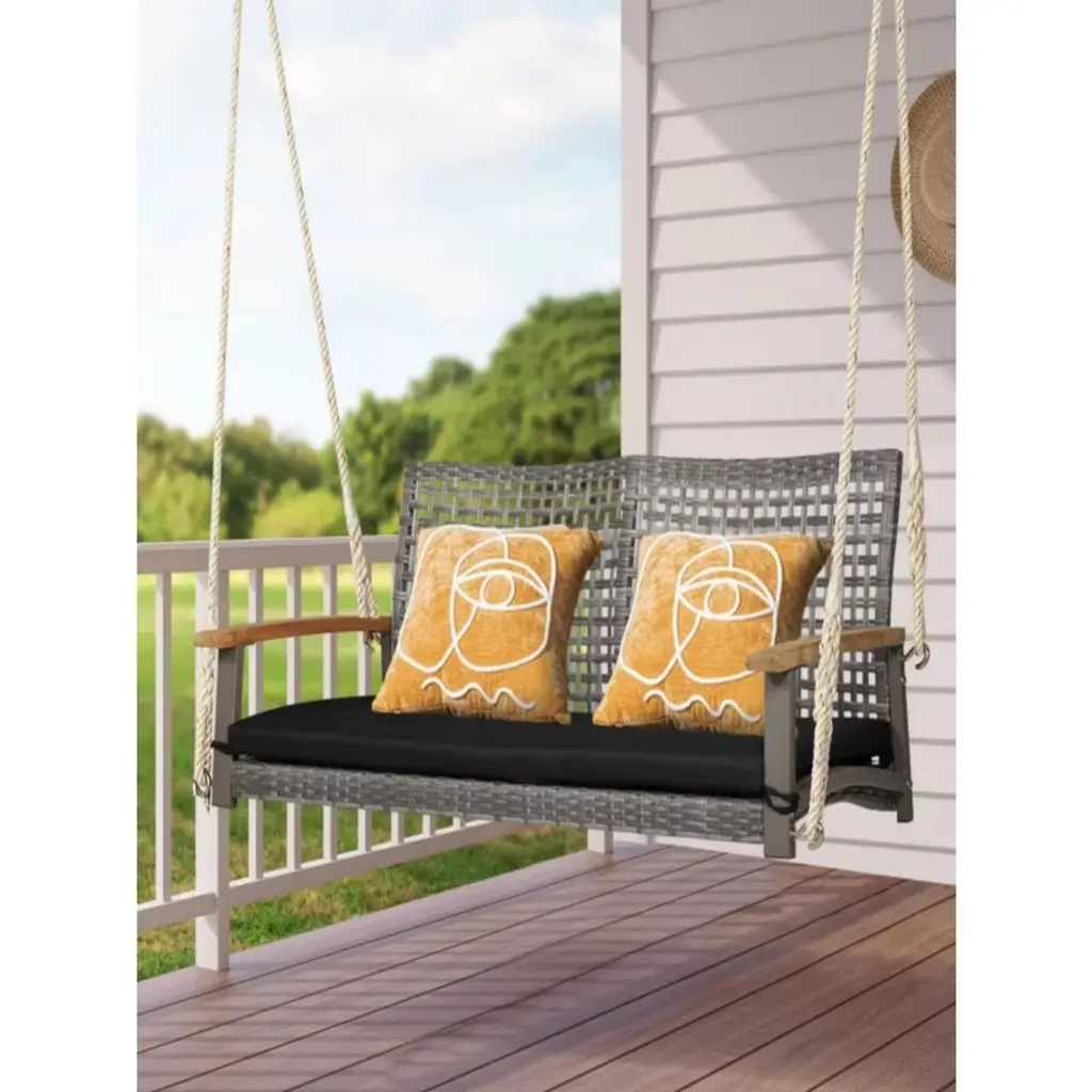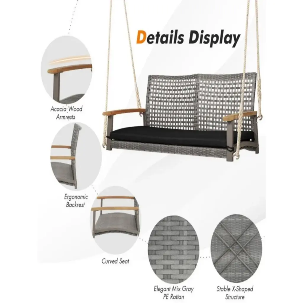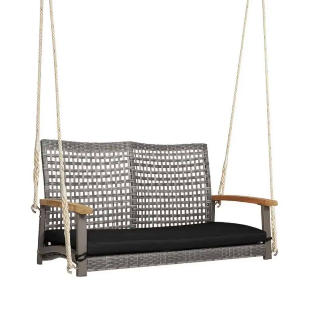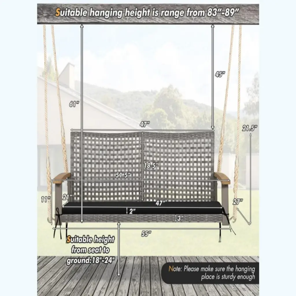 Mix Grey Wicker 2-Seater Swing: Sway into Double Comfort Under Open Skies As sunlight filters through your porch, this 29 lbs mix grey wicker swing rests like a floating haven, its 55" frame inviting two to unwind. The 47" wide seat, curved backrest, and acacia wood armrests form a natural cradle, while the high-density foam cushion—with a removable, washable cover—offers cloud-like comfort, secured by fixing straps for no-slip relaxation. A heavy-duty steel frame, coated for rust resistance, supports up to 800 lbs, wrapped in weather-resistant mix grey PE wicker that shrugs off sun and rain. Two 118" hanging ropes with solid screw-in hooks ensure stable installation on porches, trees, or garden arbors, adapting to your favorite outdoor spots. Included hardware and clear instructions mean assembly takes just 20 minutes, with a lightweight design for easy relocation. As evening falls, the swing’s gentle motion weaves a story of durability and design—where acacia wood’s warmth meets wicker’s resilience. Perfect for shared moments or quiet solitude, it transforms any outdoor space into a sanctuary of comfort, where every sway is a celebration of nature and togetherness.