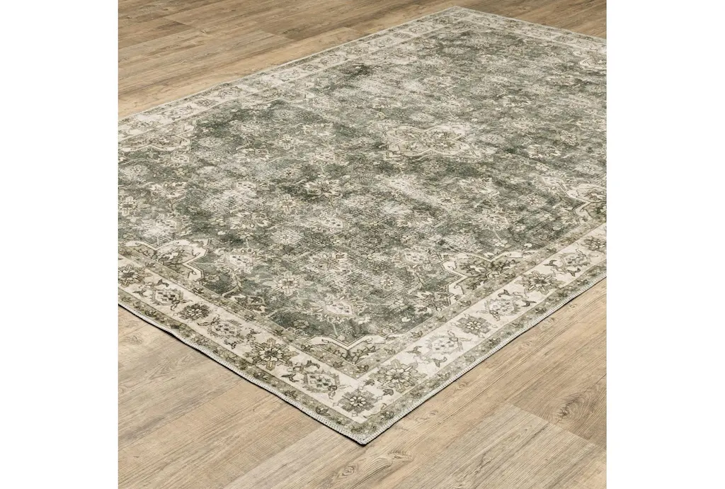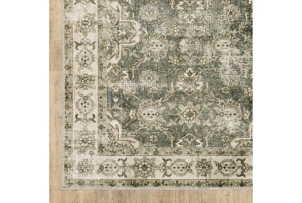 This 5'x7' machine washable rug features a traditional style and is made of polyester in a pewter color.