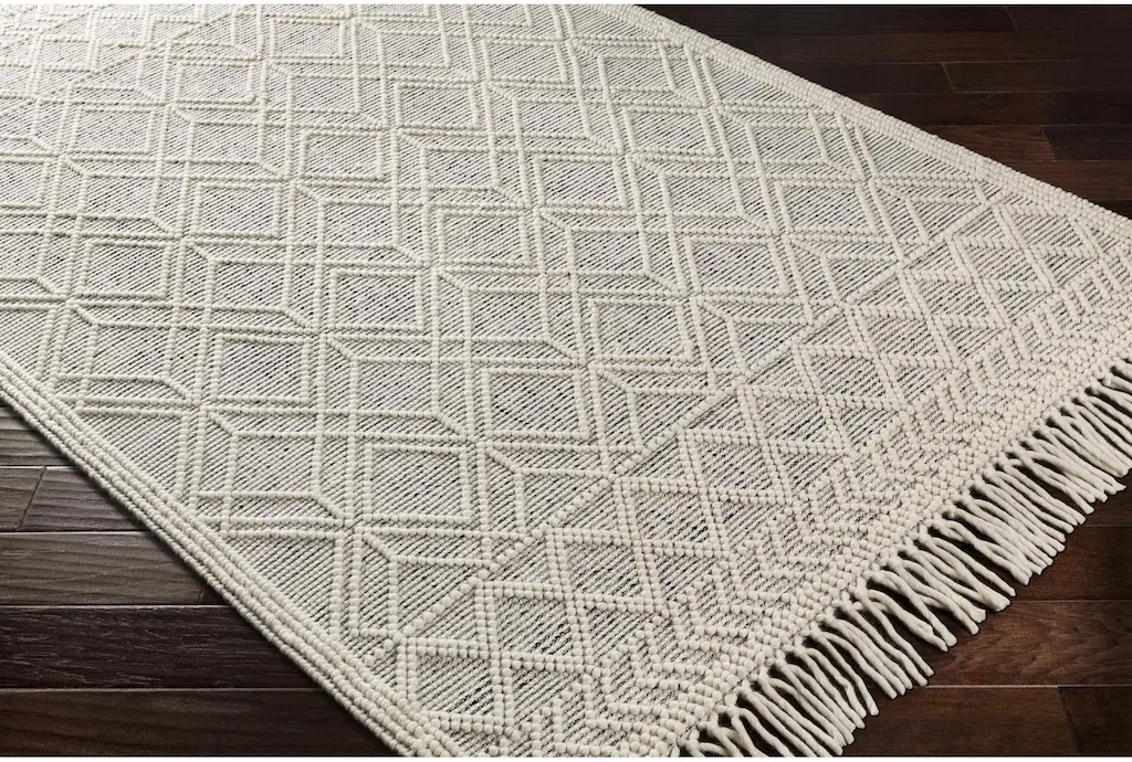 Enhance your living space with the beautiful 5'X7'5" Rectangle Fiber Rug from Surya. This handwoven rug features an ivory fringe and geometric design, perfect for indoor use. Its low pile makes it an ideal choice for high-traffic areas like entryways and living rooms.