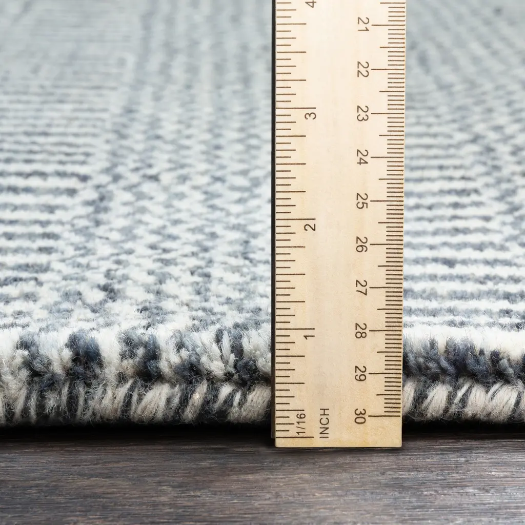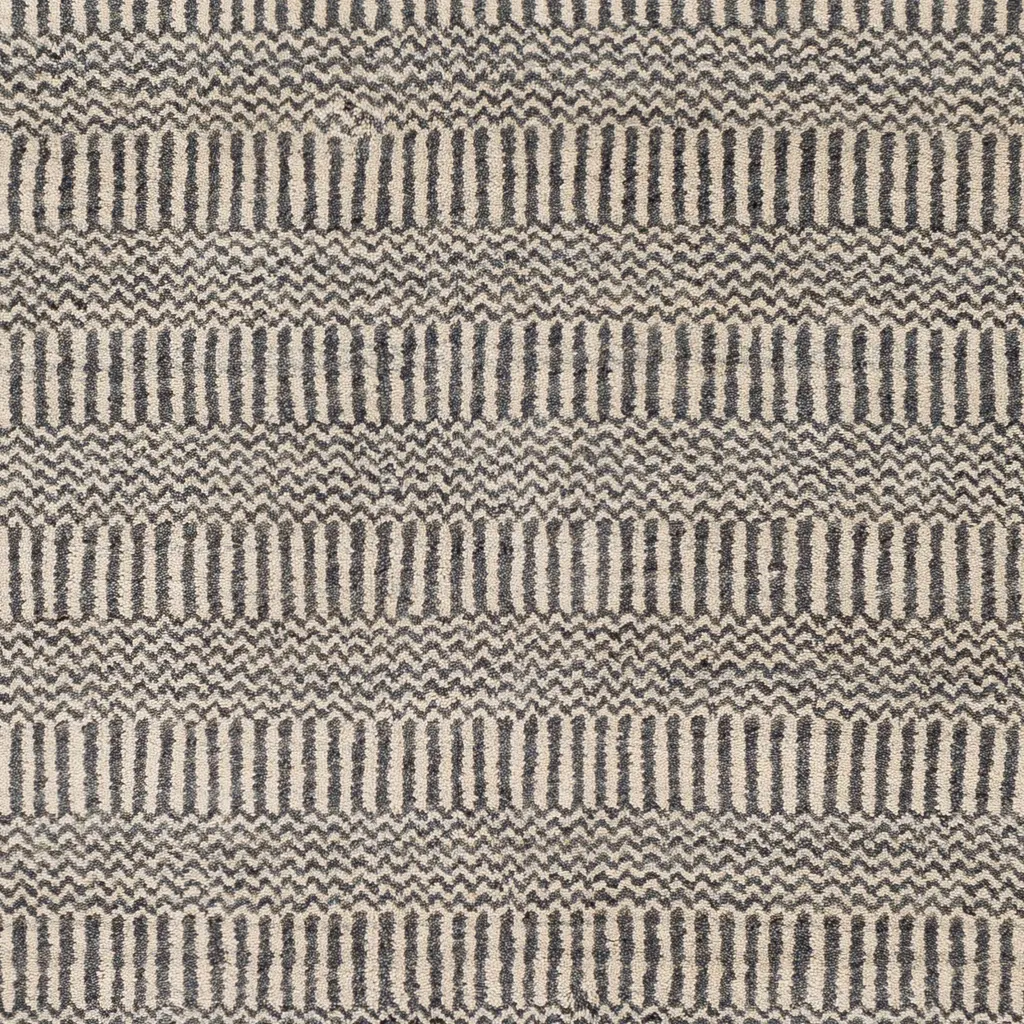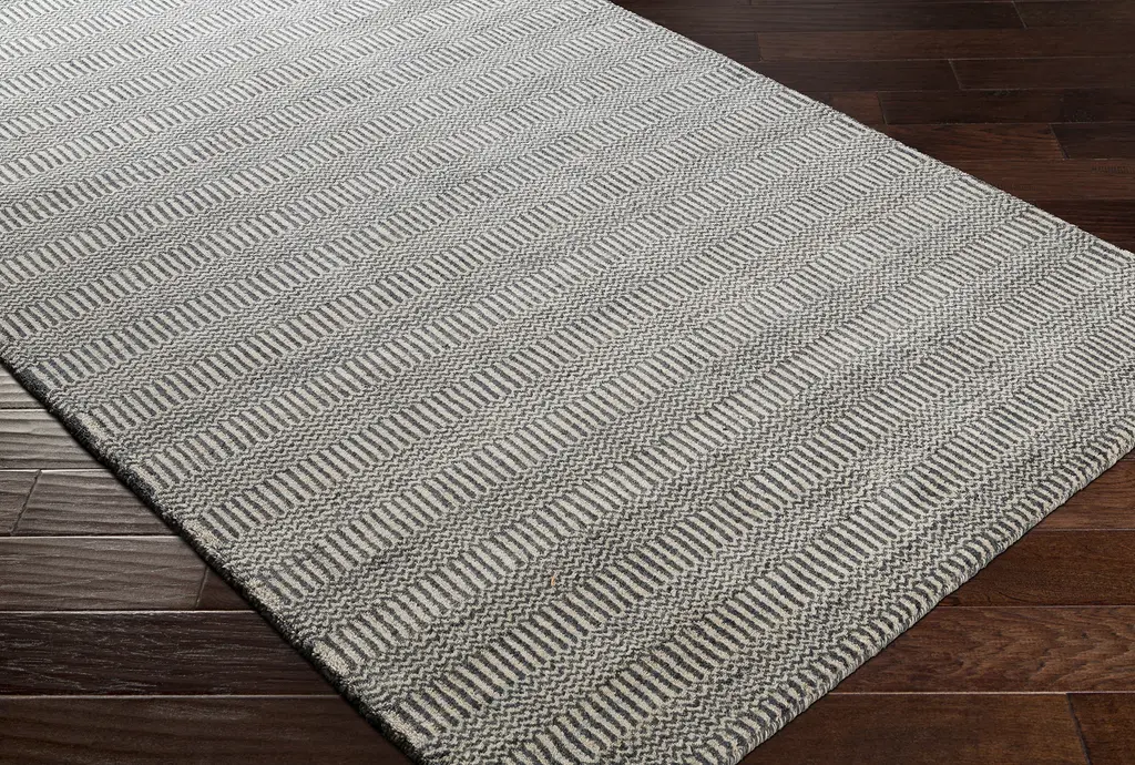 Enhance your home with the 5'x7'5" Rug-Modern Cruz Stripe Charcoal/Beige by Surya. This modern area rug in dark green and khaki adds a contemporary touch to any bedroom or indoor space. Made from 100% wool, it offers durability and comfort.