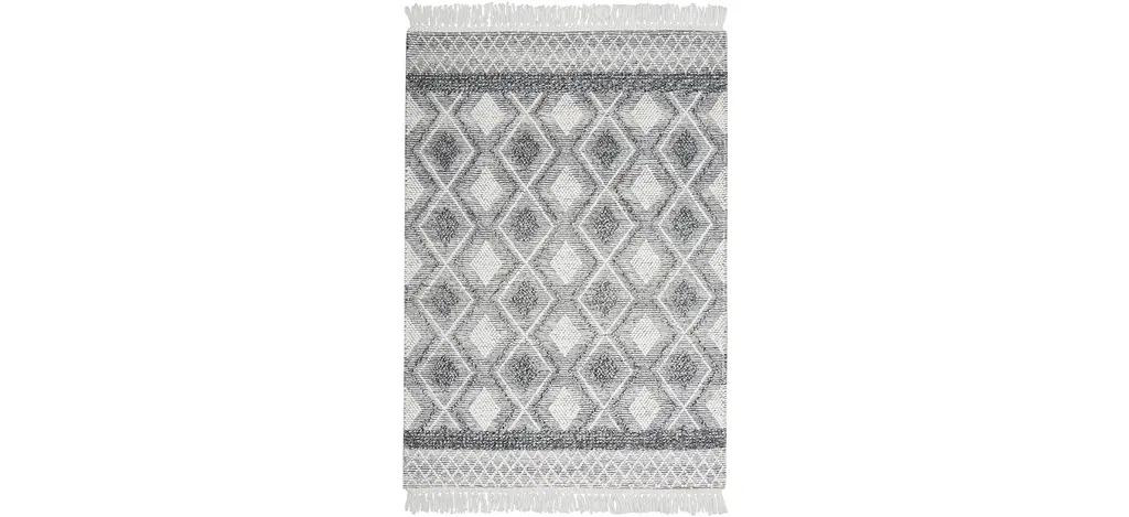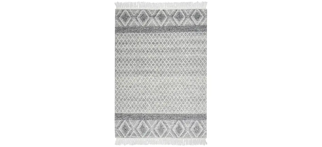 Enhance your living space with the 5'x7'5" Rug in a textured traditional boho design. The slate and grey color palette adds a touch of warmth and sophistication to any room. Made with a blend of wool, cotton, nylon, polyester, and acrylic, this low pile rug offers durability and style.
