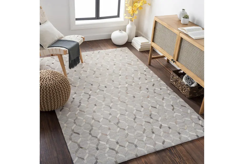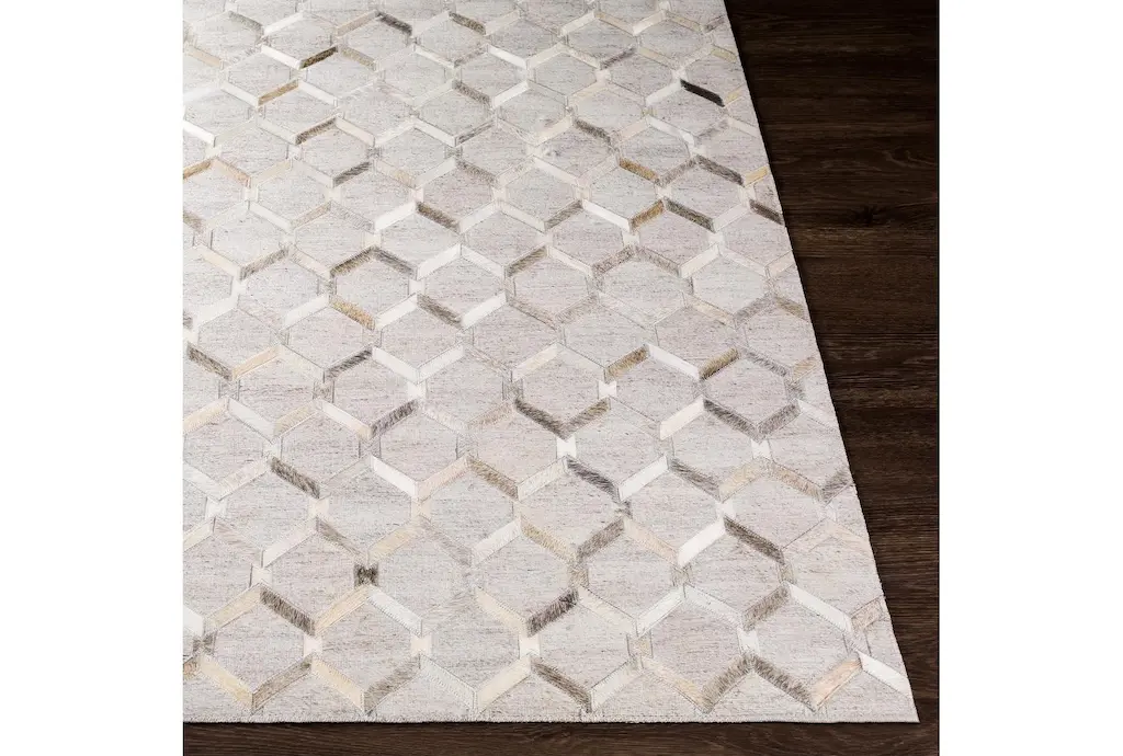 Elevate your interior decor with the 5'x7'5" rug by Surya, featuring a stunning honeycomb light grey lattice pattern. Perfect for living rooms and other indoor spaces, this rug combines the soft texture of viscose with the durability of hair on hide fibers. Its neutral color palette of camel, medium grey, cream, and light grey seamlessly complements a variety of rustic and contemporary styles.