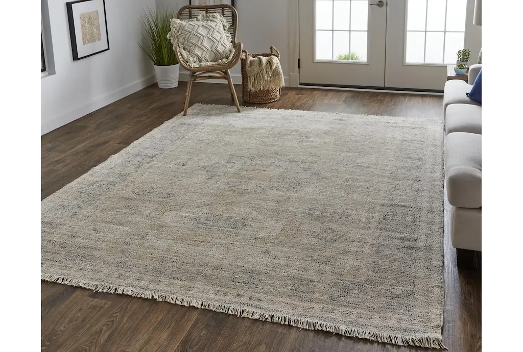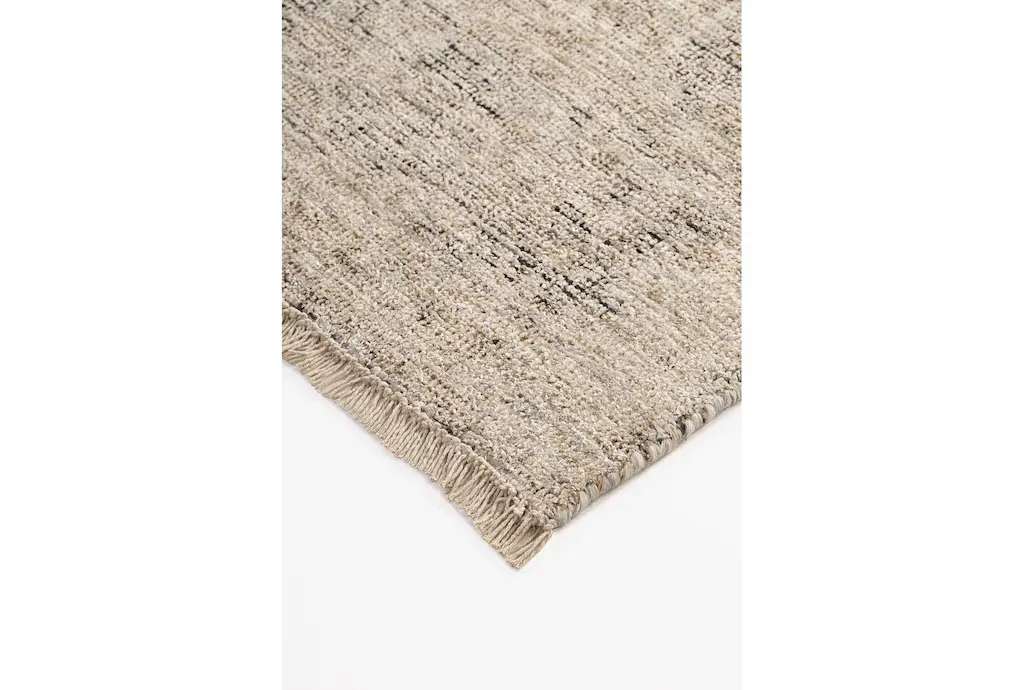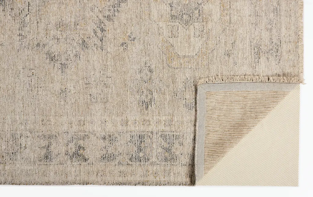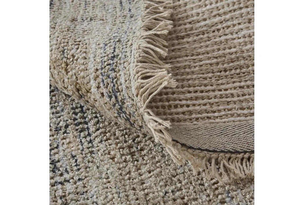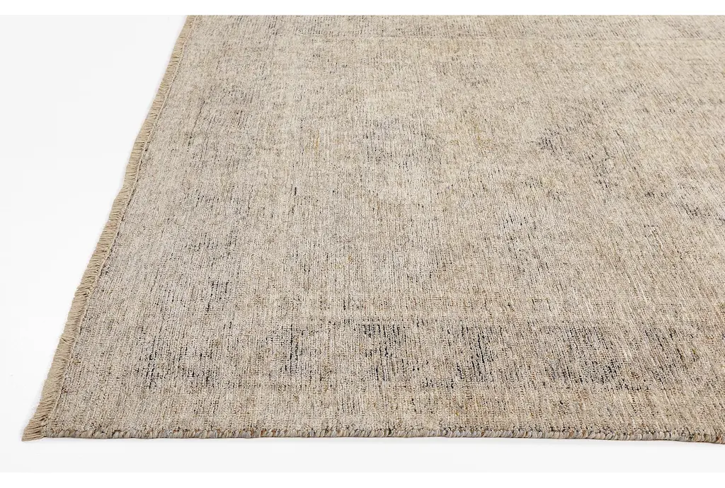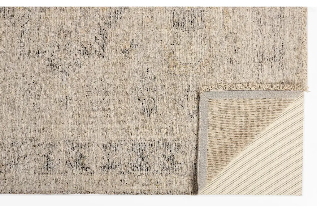 This 5'x7'5" wool rug brings a touch of faded traditional charm to any indoor living space. The muted sand color and low pile design make it perfect for adding a subtle yet stylish element to your decor. Crafted from a blend of jute, wool, polyester, viscose, and cotton, this rectangle rug offers durability and softness.