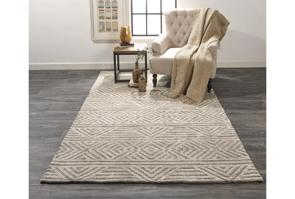 Enhance your indoor space with the 5'x8' Rug Cotton Micro Fiber Geometric Brown Rectangle. This versatile low pile rug is ideal for layering and adds a rustic touch to any room. Made with an 80% micro polyester and 20% cotton blend, it combines durability with a soft feel underfoot.