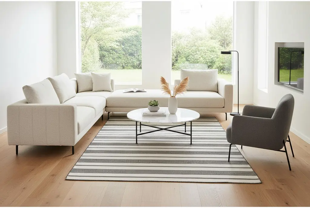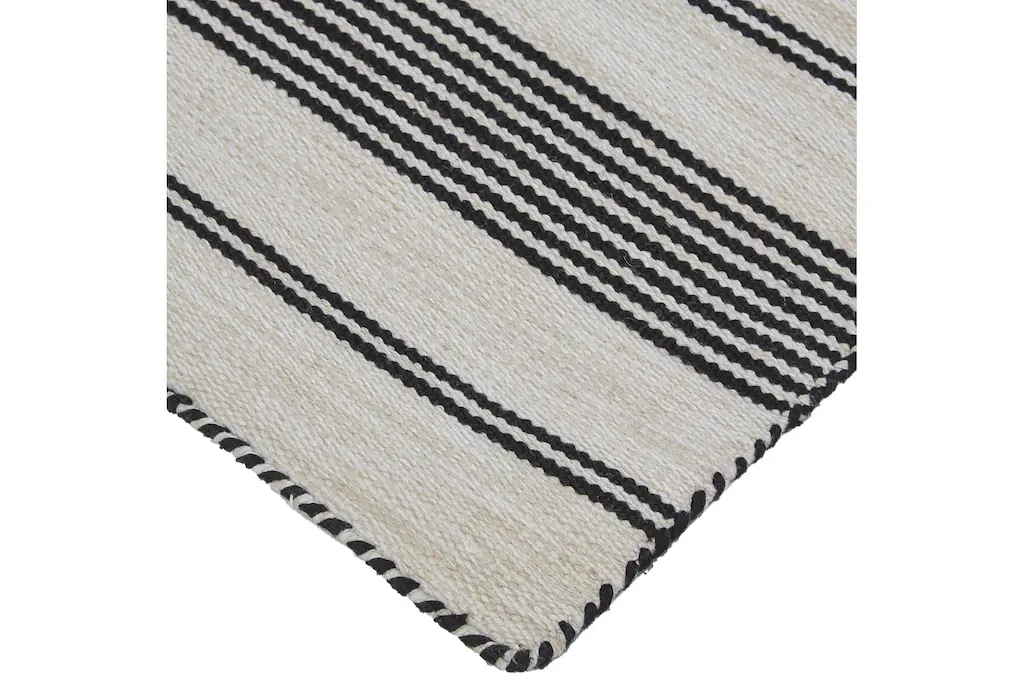 Enhance your living space with the 5'x8' Rug-Recycled Pet Fiber Black Pin Stripes. This contemporary low pile dhurrie rug is perfect for layering in any room, whether it's your laundry, living room, or office. Made from durable polyester, it offers a stylish and practical addition to your home.