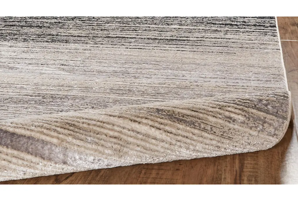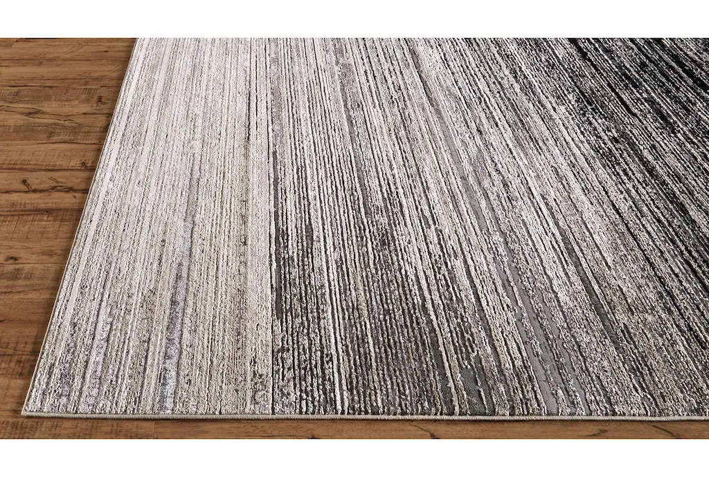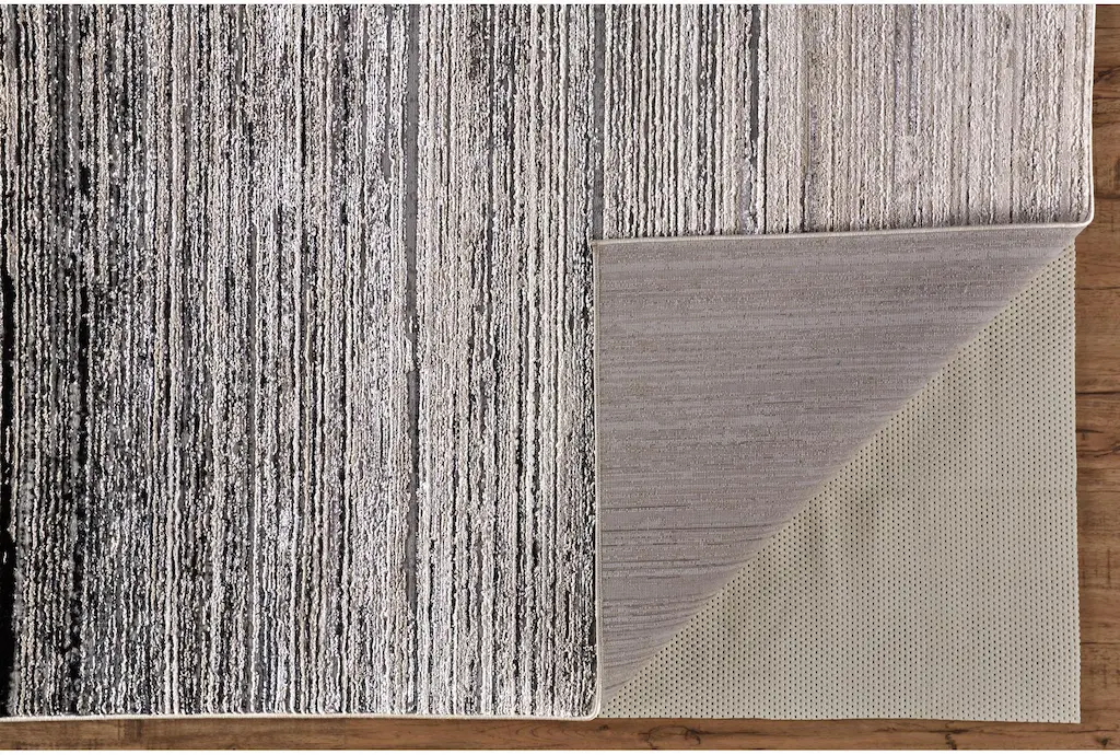 Enhance your living space with the 5'x8' Rug in Silver Metallic and Black Horizontal Ombre design. This contemporary piece features an abstract pattern perfect for layering in any room. The low pile construction ensures easy maintenance and durability.