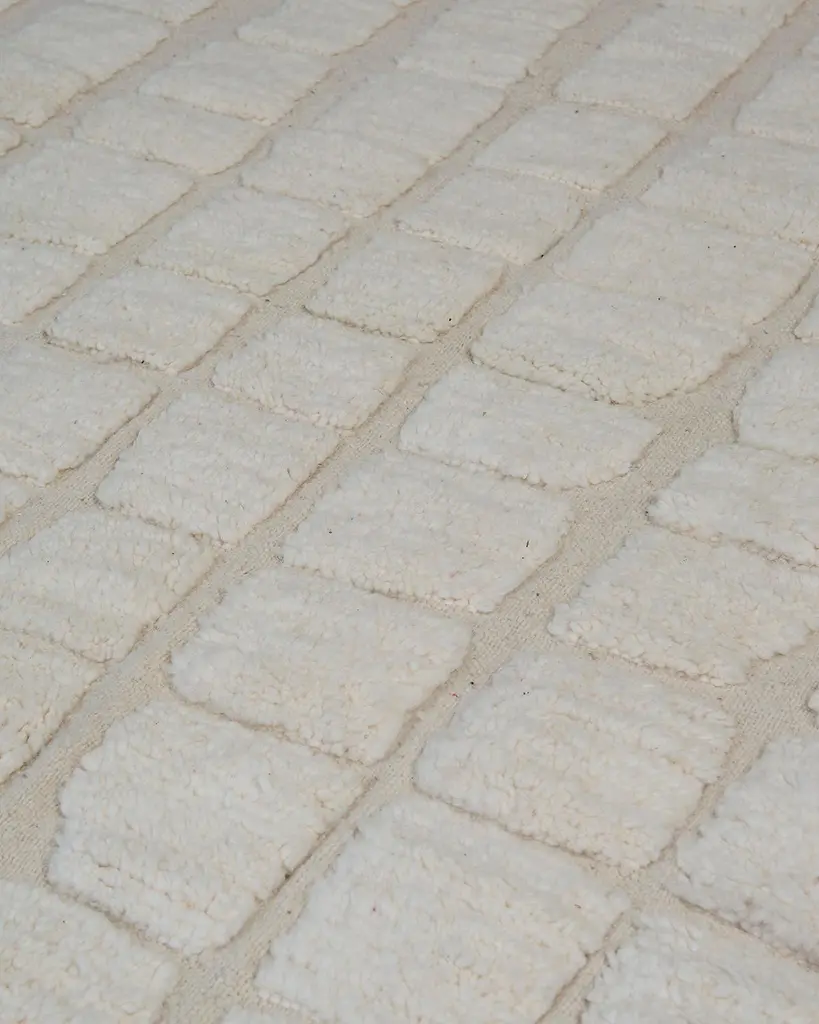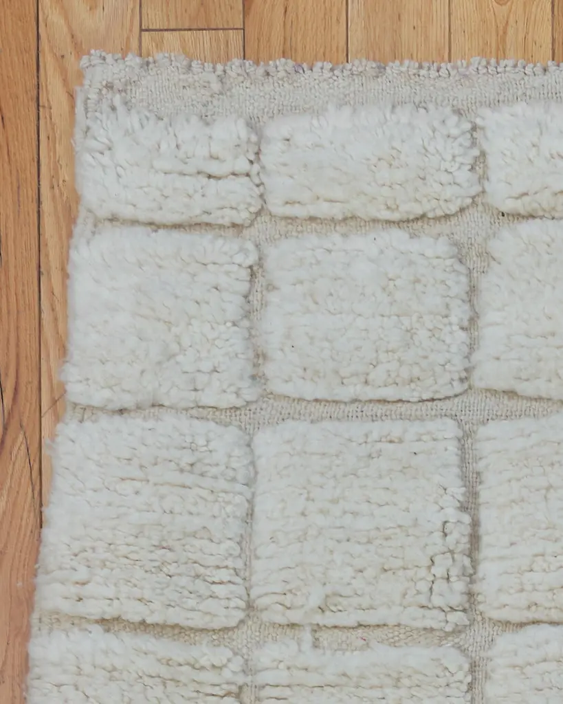 The Columba rug is a stunning Beni Ouarain piece, handwoven by Berber artisans in the Atlas Mountains of Morocco. Featuring a rich cream background, this rug showcases intricate, minimalist geometric designs that are characteristic of traditional Beni Ouarain craftsmanship. Made from 100% natural sheep's wool, the thick woolen texture offers exceptional comfort and durability, making it a perfect addition to any space.Dimensions:L: 9'7 1/2" (115 1/2")W: 6'1" (73")Estimated Weight: 40 lbsShipping Dimensions: 12” H x 12” W x 120” L (rolled)Material: 100% sheep’s woolCare: Vacuum regularly, avoiding abrasive brushes. Spot clean spills immediately. Do not dry clean; for deep cleaning, consult a professional.Beni Ouarain rugs are highly prized for their artistry, durability, and timeless appeal. The Columba rug, with its soft cream tones and geometric design, complements a wide range of interior styles, from modern to traditional. Whether placed in a living room, bedroom, or hallway, this rug adds both warmth and sophistication to your home.