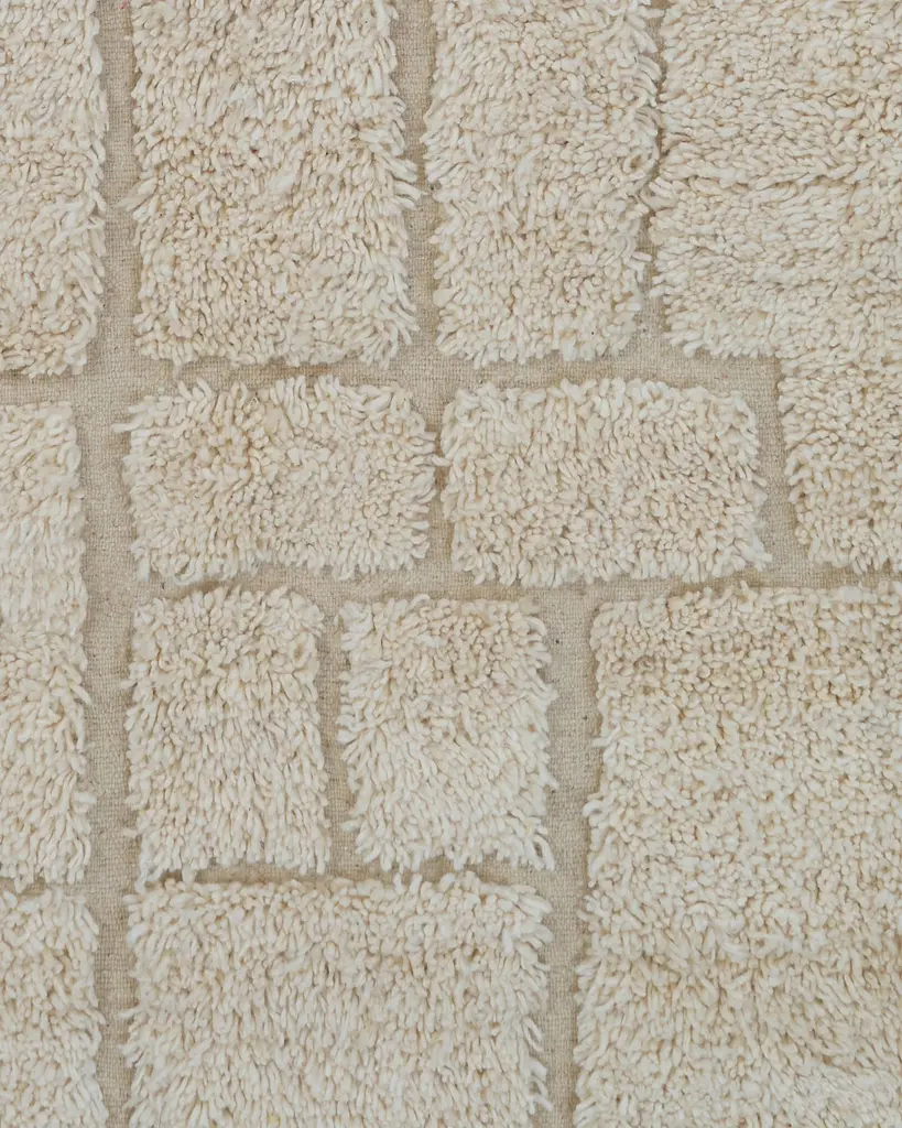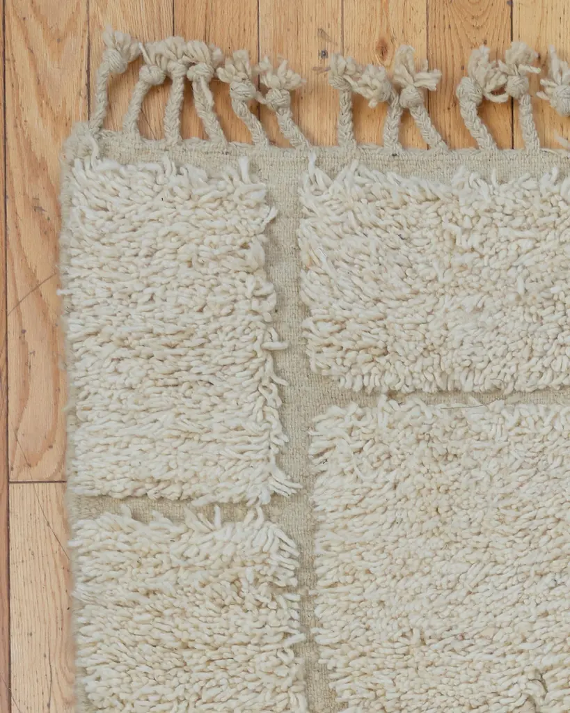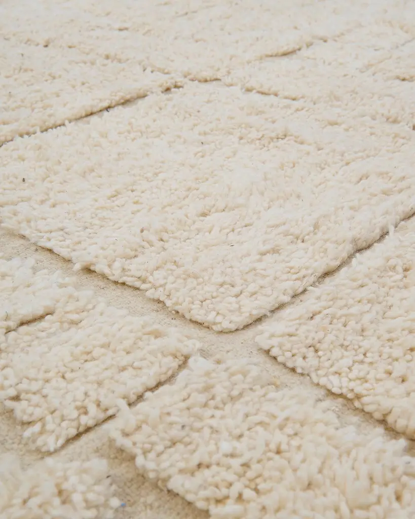 The Egretta rug is a beautiful Beni Ouarain piece, handwoven by Berber artisans in the Atlas Mountains of Morocco. Featuring a soft cream background with interesting irregular shapes represented in the thick piles, this rug showcases intricate, minimalist geometric patterns that are characteristic of the Beni Ouarain style. Made from 100% natural sheep’s wool, the thick, plush texture provides both comfort and warmth, making it a luxurious addition to any space.Dimensions:L: 8'11" (107")W: 6'5" (62")Material: 100% sheep’s woolCare: Vacuum regularly, avoiding abrasive brushes. Spot clean spills immediately. Do not dry clean; for deep cleaning, consult a professional.Beni Ouarain rugs are prized for their durable craftsmanship and timeless design. The Egretta rug, with its delicate pink highlights and geometric detail, adds a sophisticated yet cozy touch to any interior. Whether in a living room, bedroom, or hallway, this rug enhances the space with both style and Moroccan heritage.