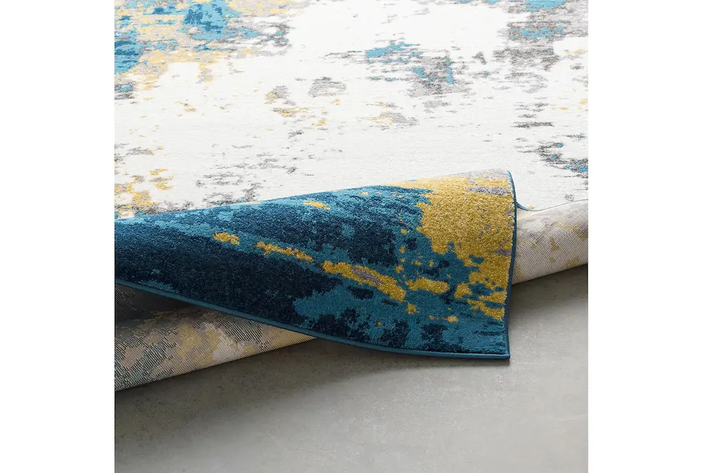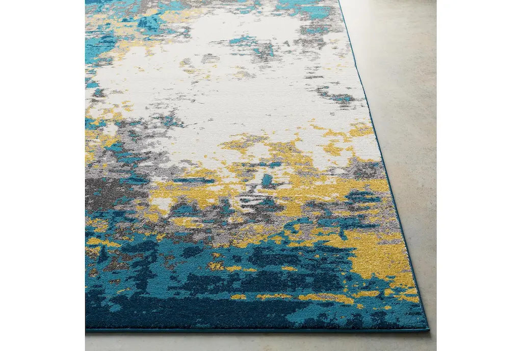 Enhance your living space with the vibrant and contemporary 6'6"x9' Fiber Rug by Surya. Featuring a stunning abstract design in shades of aqua, bright blue, mustard, charcoal, cream, and medium grey, this low pile rug adds a burst of color and texture to any room. Crafted from 100% polypropylene, it offers durability and easy maintenance, making it perfect for high-traffic indoor areas.