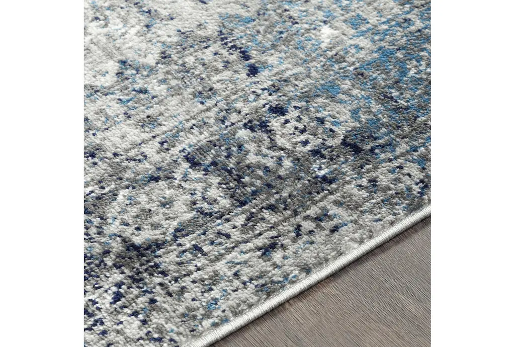 Enhance your living space with the 6'6"X9' Fiber Rug-Traditional Grey & Blue Subtle by Surya. This rectangle rug features a beautiful blend of light grey, charcoal, sky blue, navy, and white colors. Made from durable polypropylene, it is designed for indoor use and offers a low pile for easy maintenance.