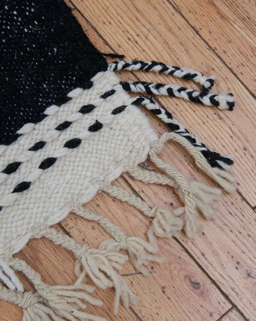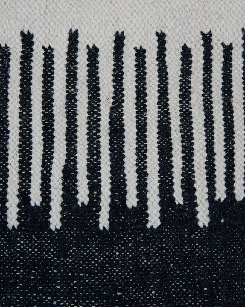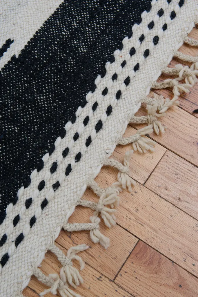 The Noir rug is a striking Moroccan flatweave that blends bold contrast with refined craftsmanship. Handwoven from 100% natural sheep’s wool, this cream and black rug features a minimalist yet impactful design, ideal for grounding modern, bohemian, or eclectic interiors. Its flatweave construction offers a lightweight, low-profile option with a sleek, organic texture that works beautifully in high-traffic areas like living rooms, dining spaces, or under beds.Woven by skilled artisans in Morocco, Noir celebrates the timeless traditions of Berber textile design while introducing a contemporary edge through its clean palette and strong graphic presence. The soft cream base is accented with linear black motifs, creating balance and depth without overwhelming the space.Care Instructions: Vacuum gently with a non-abrasive brush. Spot clean spills promptly. Do not dry clean. For deep cleaning, consult a professional rug specialist.Noir is the definition of effortless sophistication—where heritage meets modern form.