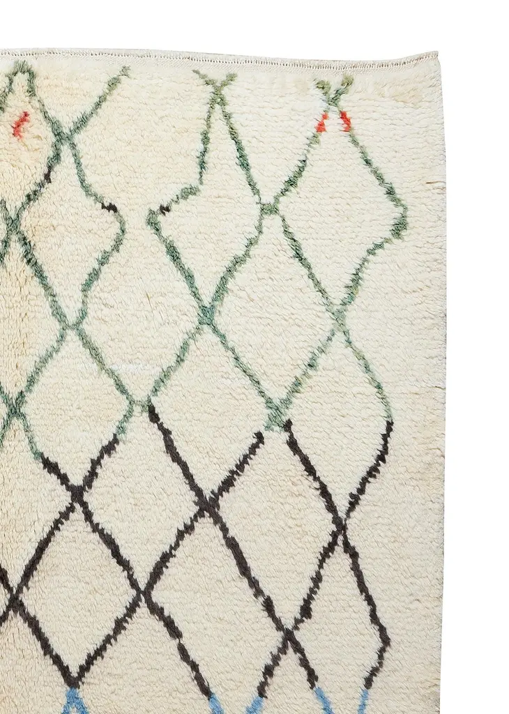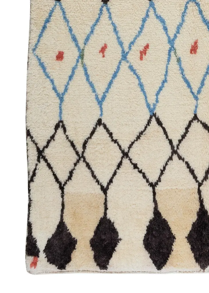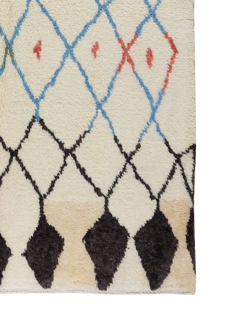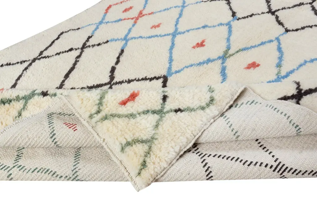 This 6x8 ft Moroccan-style rug is a newly handwoven creation by our skilled team in Turkey, crafted entirely from 100% wool with a wool foundation for durability, warmth, and authenticity. Inspired by traditional Berber weaving, the rug features an ivory ground adorned with a diamond lattice pattern, accented by playful touches of blue, green, and coral tones. Along the base, bold geometric motifs in black and camel add depth and visual grounding, giving the piece a strong tribal character.A balance of tradition and modernity, this rug’s mix of neutral and colorful details makes it a versatile centerpiece for a wide range of interiors — from Bohemian and Eclectic to Scandinavian, Modern, and Contemporary spaces.Custom ProductionWe also offer custom weaving in any size or color combination within 4–6 weeks, making it an ideal choice for interior designers, stylists, and homeowners seeking bespoke handmade rugs.Styling Notes•Works beautifully in living rooms, bedrooms, and creative studio spaces•Complements both neutral interiors and color-forward décor•Adds warmth and texture to Bohemian, Scandinavian, Minimalist, and Modern eclectic designs•A perfect balance of authentic Moroccan influence and contemporary versatilityThis rug is available in 6x8 Ft (184x245 cm), 8 x 10 Ft (243 x 305 cm) and 6.8 x 10.5 Ft (205 x 320 cm) for fast dispatch.