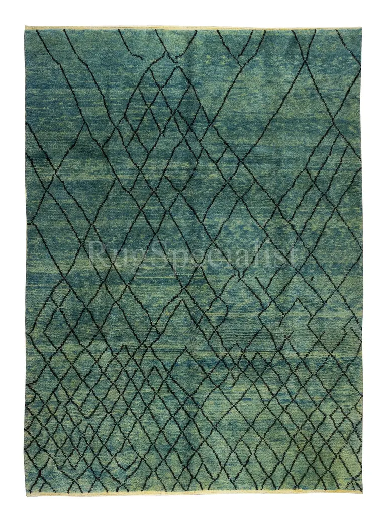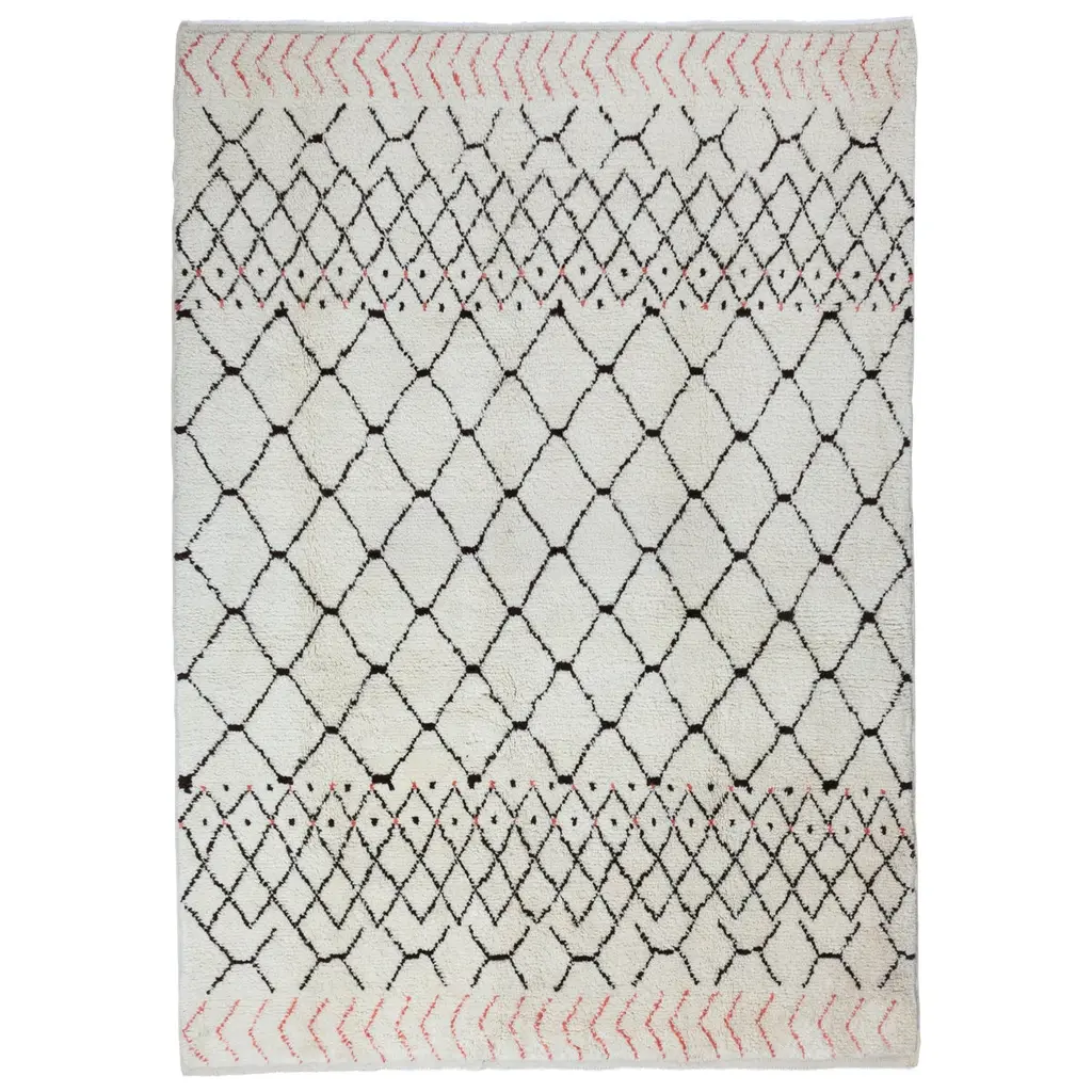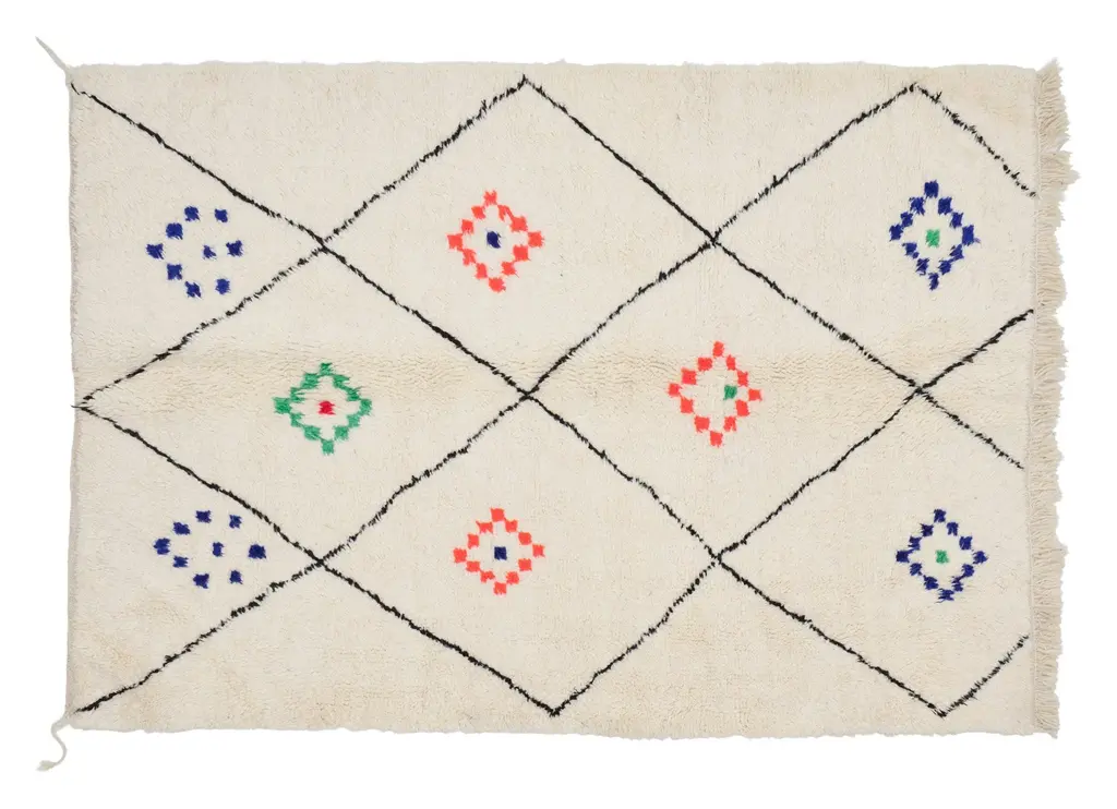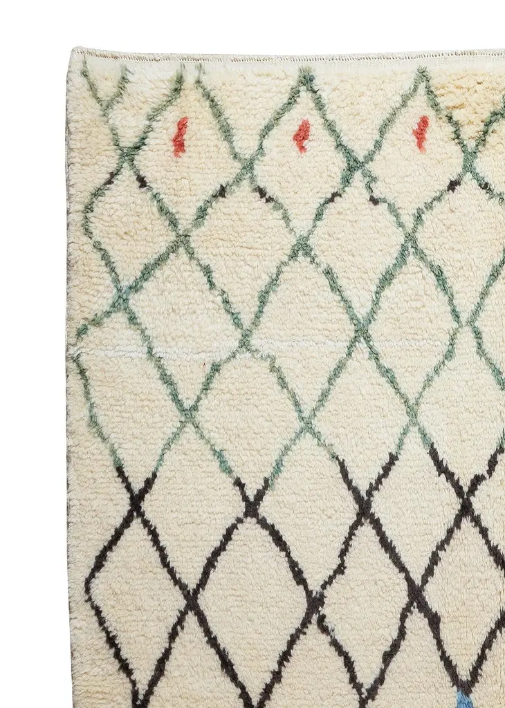 This 6x8 ft Moroccan-style rug is a newly handwoven creation by our skilled team in Turkey, crafted entirely from 100% wool with a wool foundation for durability, warmth, and authenticity. Inspired by traditional Berber weaving, the rug features an ivory ground adorned with a diamond lattice pattern, accented by playful touches of blue, green, and coral tones. Along the base, bold geometric motifs in black and camel add depth and visual grounding, giving the piece a strong tribal character.A balance of tradition and modernity, this rug’s mix of neutral and colorful details makes it a versatile centerpiece for a wide range of interiors — from Bohemian and Eclectic to Scandinavian, Modern, and Contemporary spaces.Custom ProductionWe also offer custom weaving in any size or color combination within 4–6 weeks, making it an ideal choice for interior designers, stylists, and homeowners seeking bespoke handmade rugs.Styling Notes•Works beautifully in living rooms, bedrooms, and creative studio spaces•Complements both neutral interiors and color-forward décor•Adds warmth and texture to Bohemian, Scandinavian, Minimalist, and Modern eclectic designs•A perfect balance of authentic Moroccan influence and contemporary versatilityThis rug is available in 6x8 Ft (184x245 cm), 8 x 10 Ft (243 x 305 cm) and 6.8 x 10.5 Ft (205 x 320 cm) for fast dispatch.