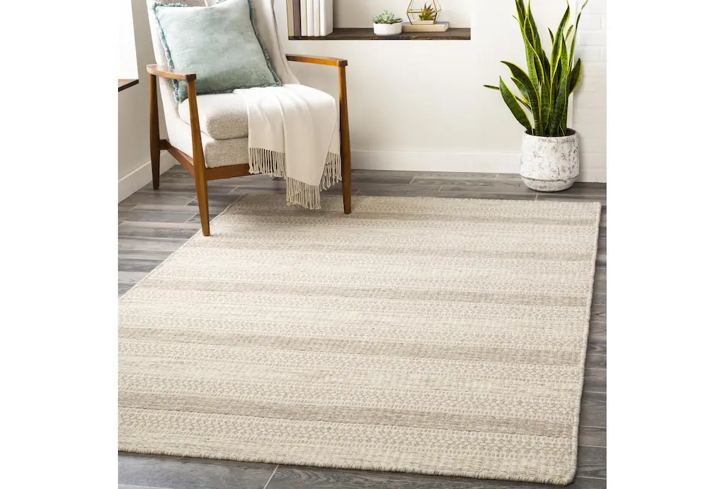 Enhance your living space with the Maisie Handwoven Fabric Stripe Rug from Surya. This 6' x 9' rectangle rug features a rustic design in cream and taupe, perfect for adding a natural touch to any room. Made with wool, it's both soft and durable for indoor use.