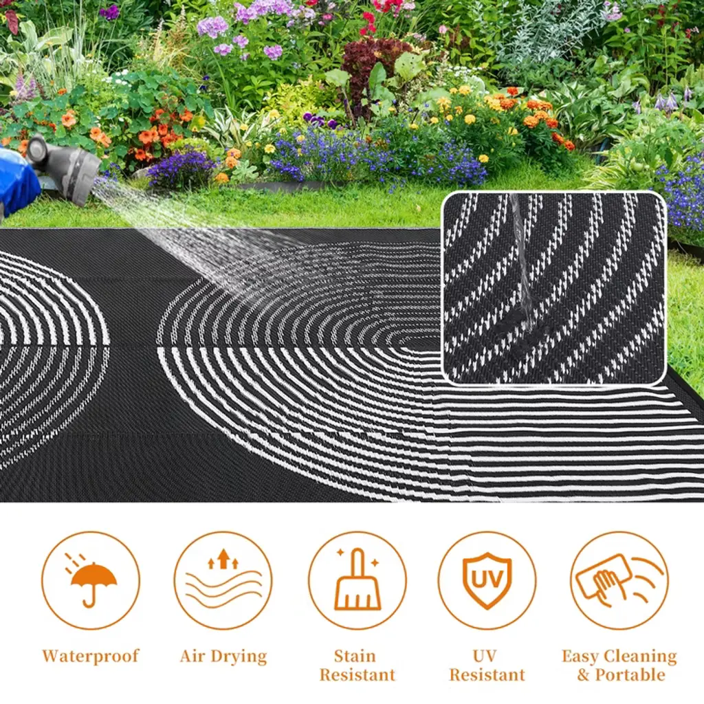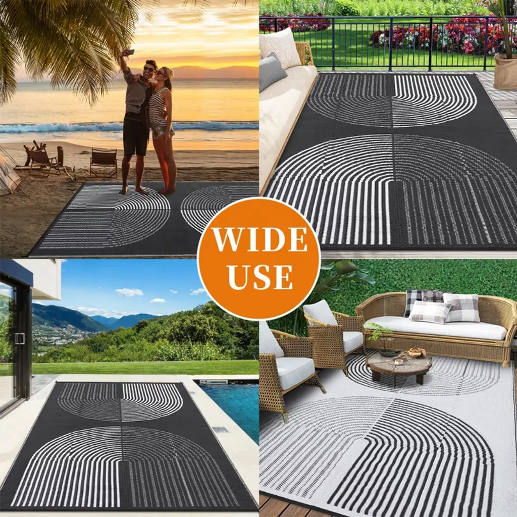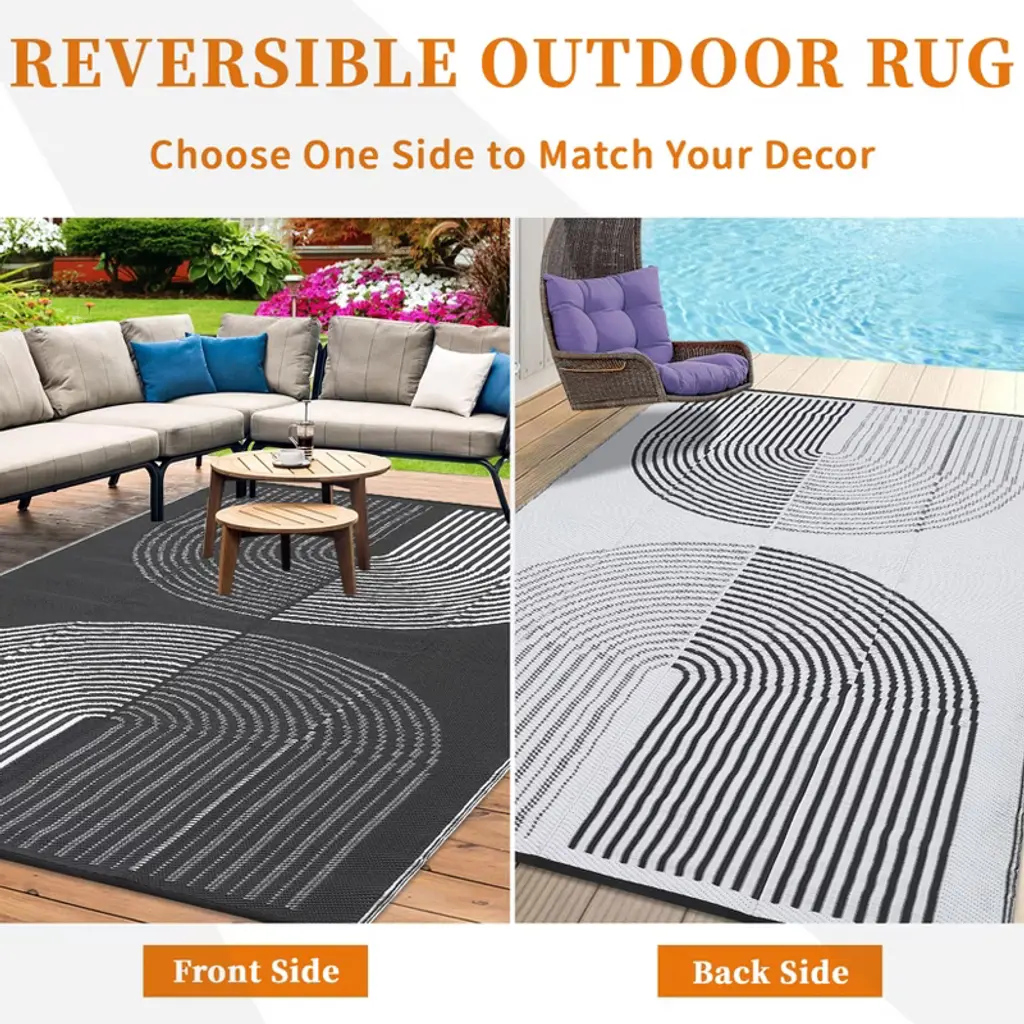 This outdoor rug is crafted from durable, stain-resistant plastic straw with reinforced edges to endure all weather conditions. Its reversible design showcases two stylish patterns, making it an ideal addition to patios, decks, beaches, picnics, and camping trips. Lightweight and foldable, the rug is easy to carry and store, bringing a modern touch to any outdoor space. Maintenance is effortless—just rinse with water or use mild detergent for tougher spots—and it dries quickly to stay fresh and ready for your next adventure.