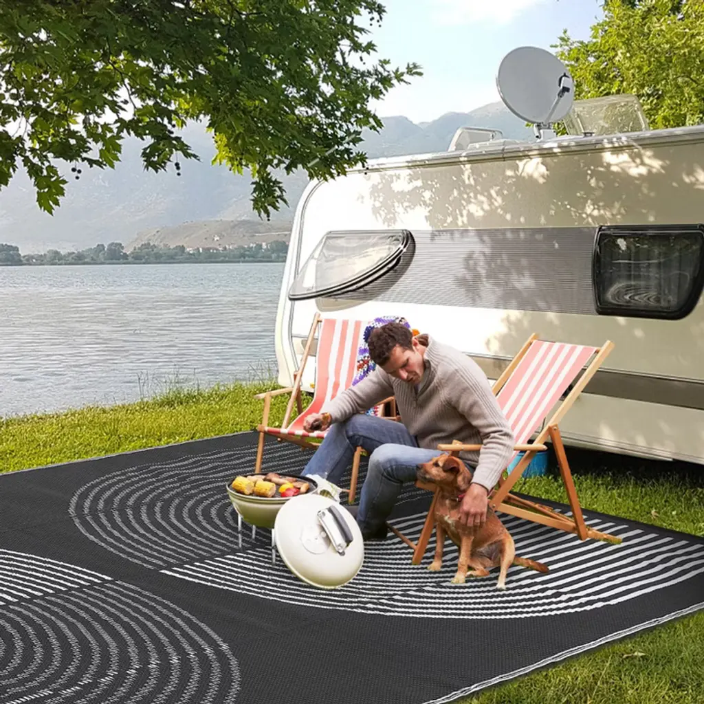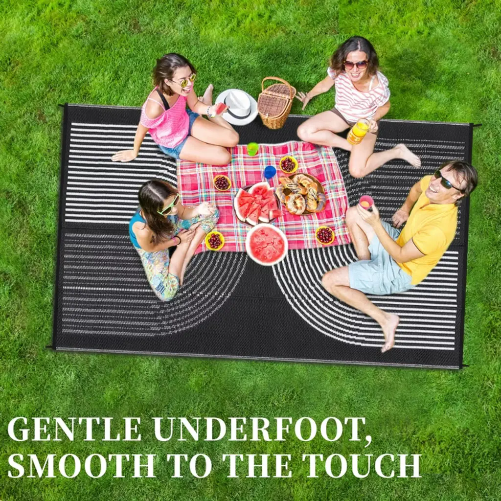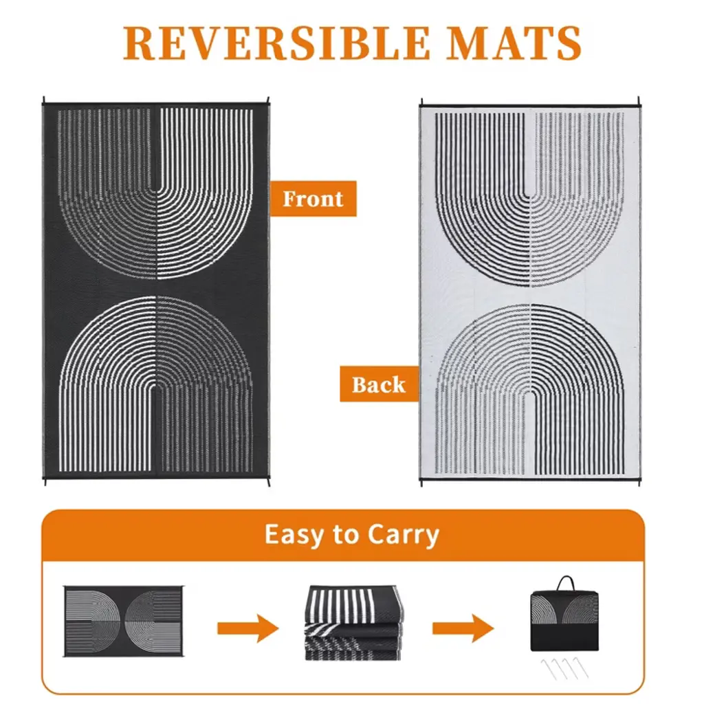 This outdoor rug is crafted from durable, stain-resistant plastic straw with reinforced edges to endure all weather conditions. Its reversible design showcases two stylish patterns, making it an ideal addition to patios, decks, beaches, picnics, and camping trips. Lightweight and foldable, the rug is easy to carry and store, bringing a modern touch to any outdoor space. Maintenance is effortless—just rinse with water or use mild detergent for tougher spots—and it dries quickly to stay fresh and ready for your next adventure.