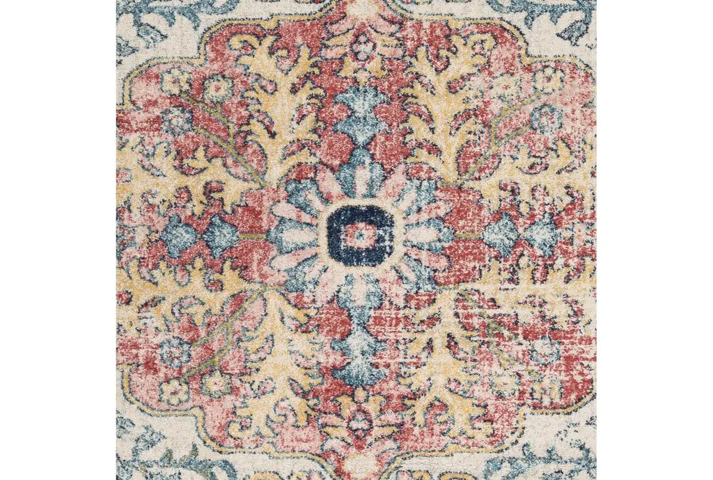 Enhance your living space with the 7'8" Round Fiber Rug-Modern Sky Blue & Garnet Muted by Surya. This beautiful multicolor rug features a modern design with a botanical motif, perfect for adding a touch of sophistication to any room. Made from durable polypropylene, this low pile rug is ideal for high-traffic areas and offers both style and functionality.