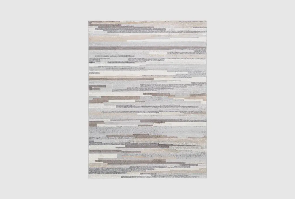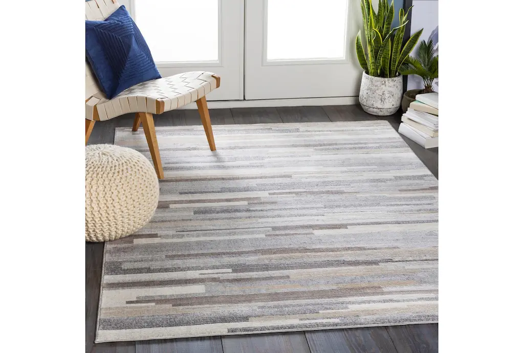This 7'8"X10' Rectangle Fiber Rug by Surya features a modern grey and camel abstract stripe design. Perfect for indoor use, this rug has a low pile that is both stylish and functional. It is crafted from 100% polypropylene, ensuring durability and ease of maintenance.