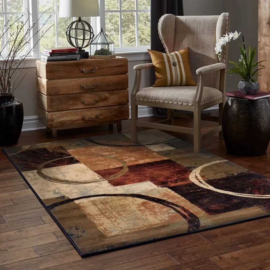 Crafted from polypropylene for durability and softness, this eye-catching area rug will bring contemporary style to your decor. The head-turning, machine-woven rug features a geometric pattern, rendered in brown, black, red, gold, beige and blue colors. This rectangular rug contains latex for added durability, making it a classic and practical choice for your home. To maintain the look and feel of your rug, blot spills immediately with a clean white cloth, vacuum regularly and spot clean using a mild soap made for the specific rug fiber. Professionally clean occasionally or when heavily soiled.
