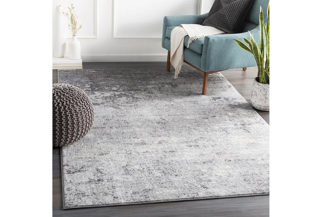 This modern rug boasts a sleek design of greys and white, measuring 7'8"x10'3" and features a low pile, making it perfect for indoor layering. Its fiber material and modern style make it an excellent addition to any living room.