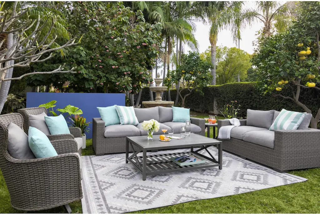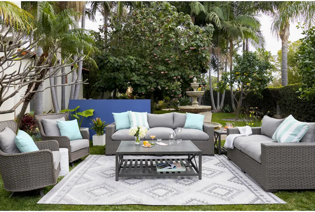 Enhance your indoor or outdoor space with the 7'8"X10'3" Indoor/Outdoor Fiber Rug-Native Grey. This contemporary geometric rug in light grey, taupe, and cream is perfect for dining rooms, living rooms, offices, or outdoor areas. Made from durable polypropylene, it features a low pile for easy maintenance and longevity.