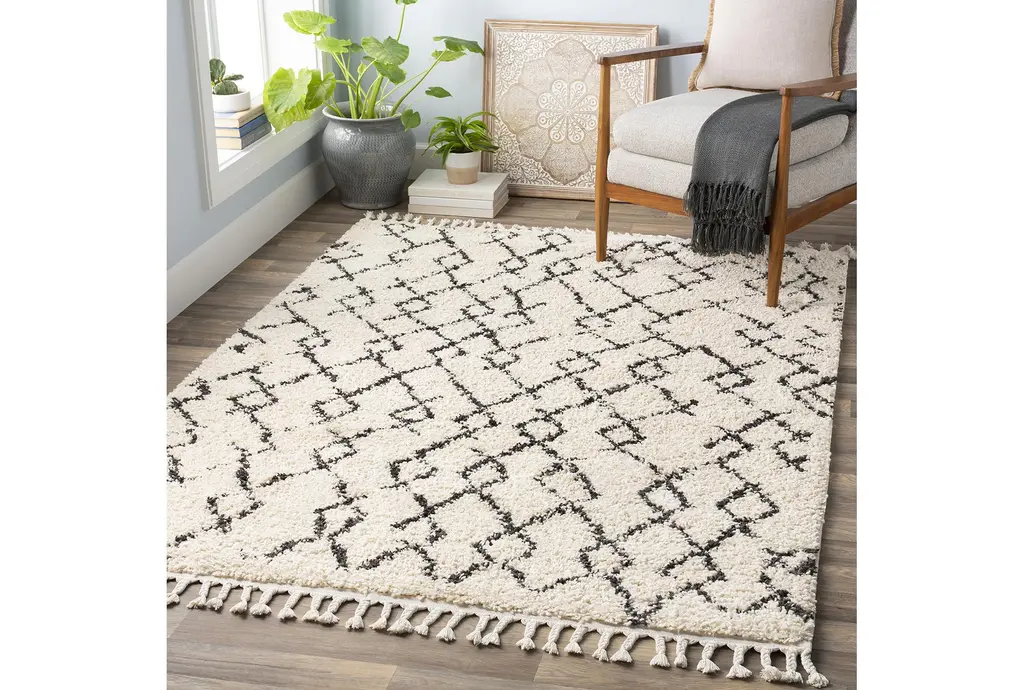 Elevate your living space with the 7'8"x7'8" Square Fiber Rug-Modern Global Shag Charcoal/Beige by Surya. This stunning rug features a modern abstract design in charcoal and beige, adding a sophisticated touch to any room. Made of 100% polypropylene, it is durable and perfect for high-traffic areas.