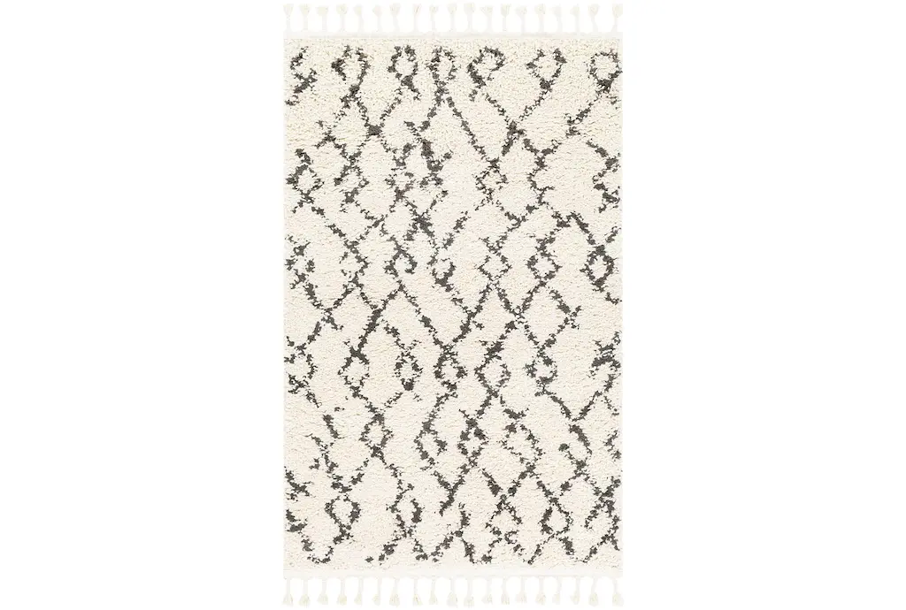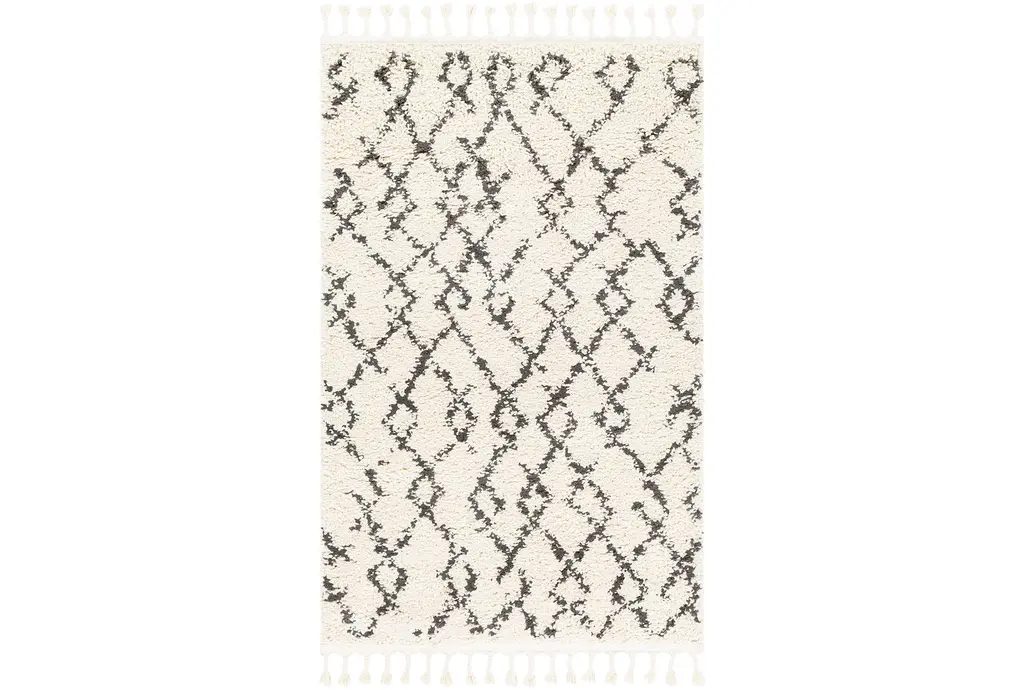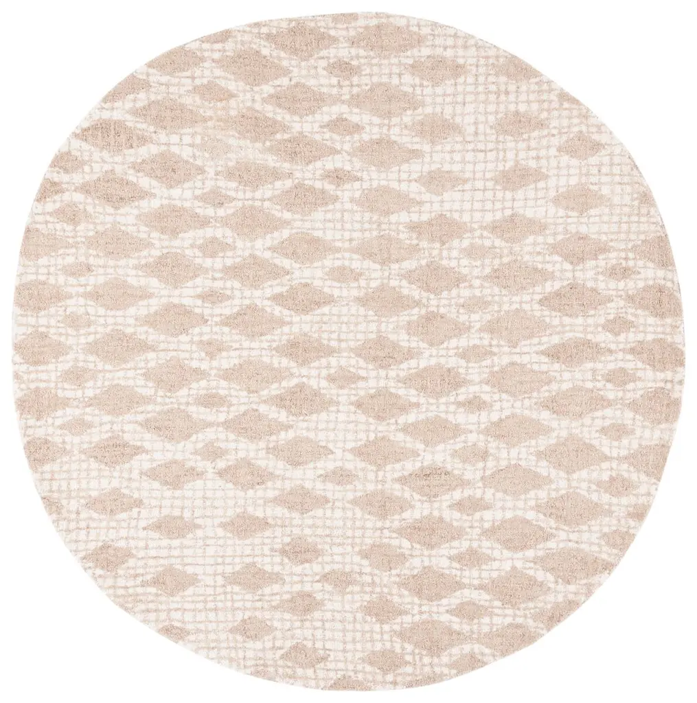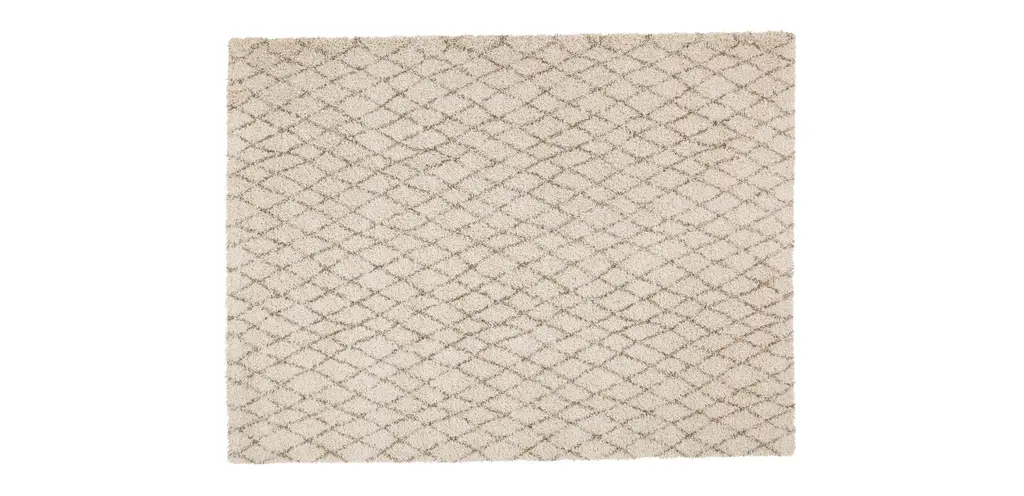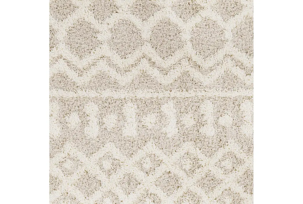 This 7'9" round rug boasts a high pile, shag texture that feels luxurious underfoot and adds a modern touch to any indoor space. Made from durable fiber, this cream and beige rug is perfect for the living room, dining room, or nursery.