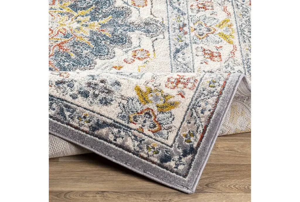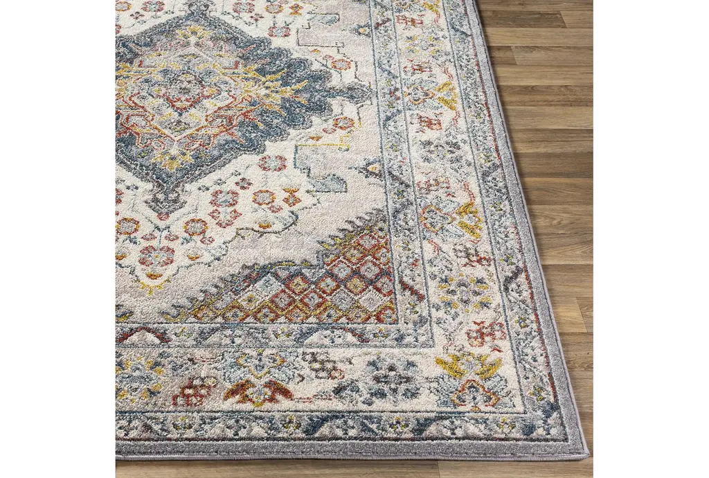 This 7'9" round rug features a traditional multicolor design, low pile, and is suitable for indoor use.