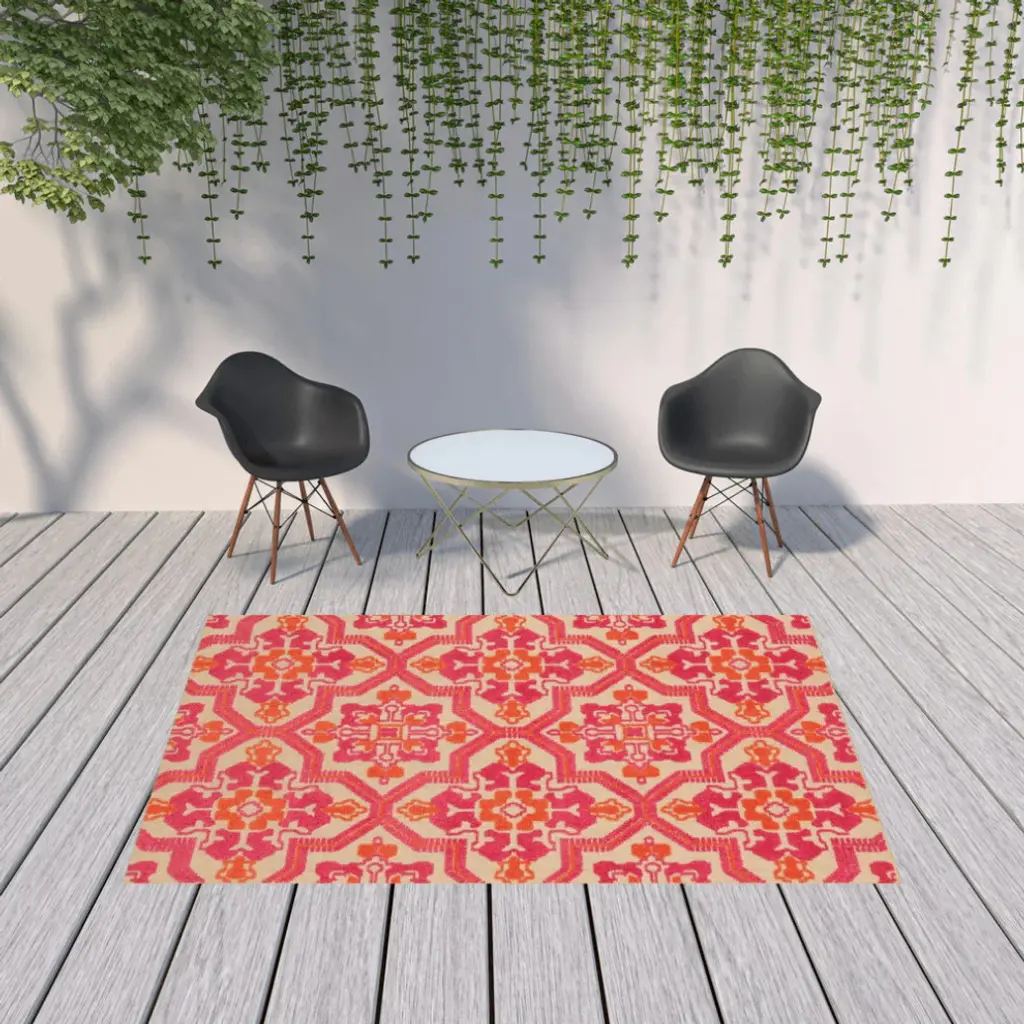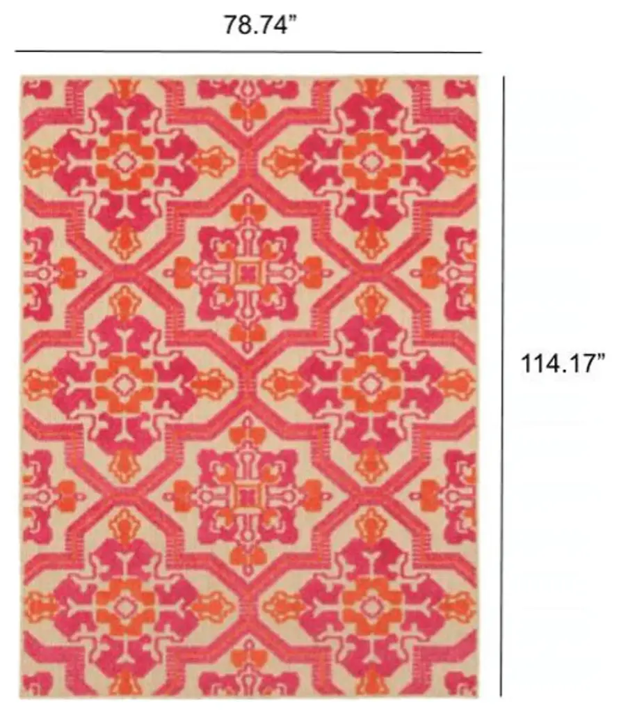 This 7-foot x 10-foot pink and orange moroccan indoor outdoor area rug, is a great way to add warmth to a room. This rectangle shaped rug features a moroccan design in pink and orange to give it visual interest. A classic shape marries with good looking design for your space Place this area rug against a hardwood or tile floor and it will enliven your living space with style and sophistication. 1-inch H x 78.74-inch W x 114.17-inch D