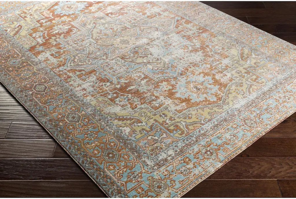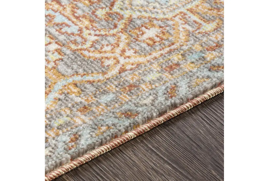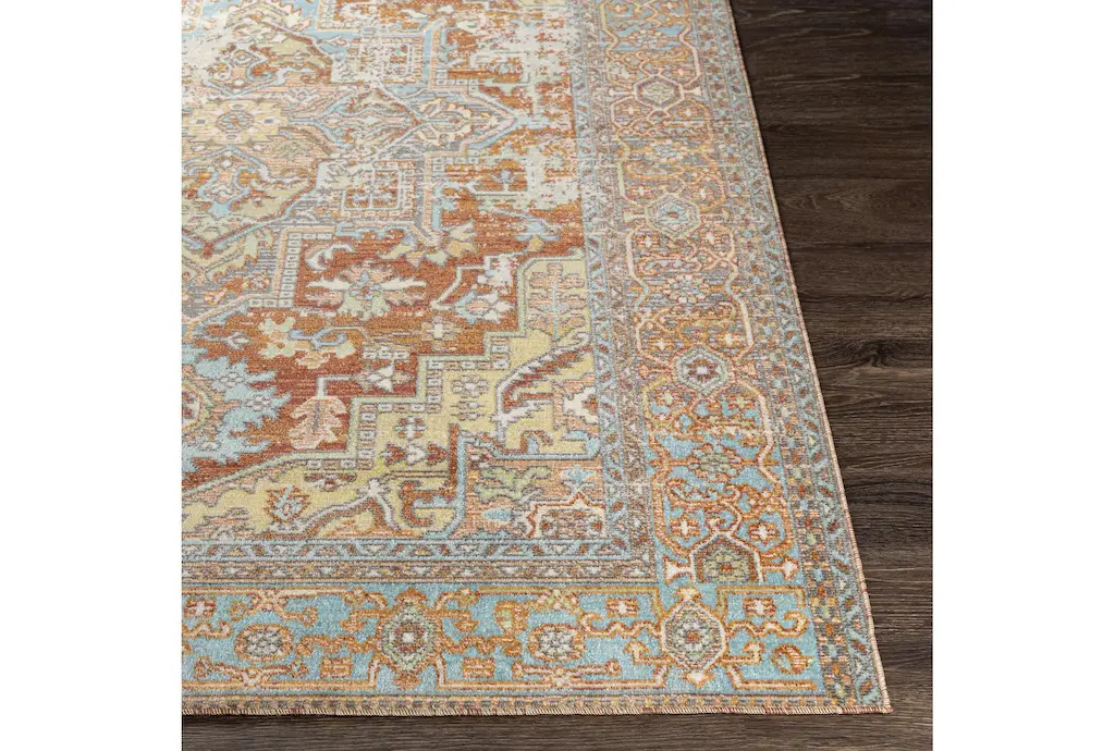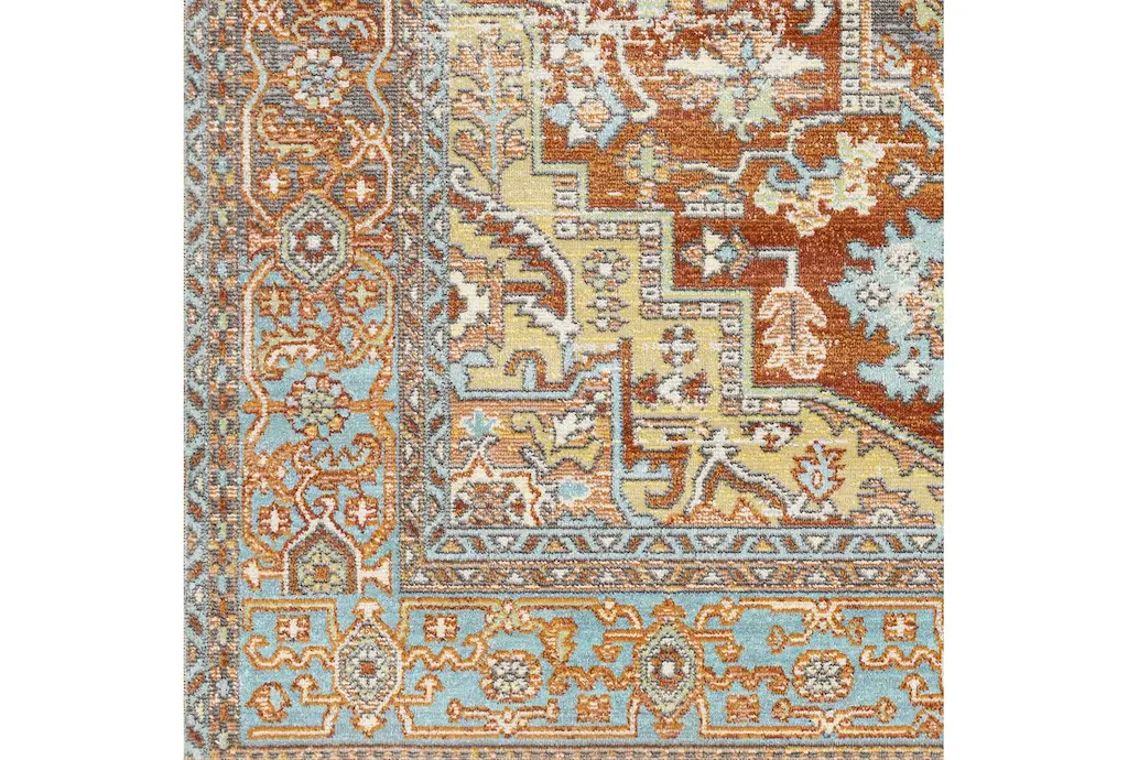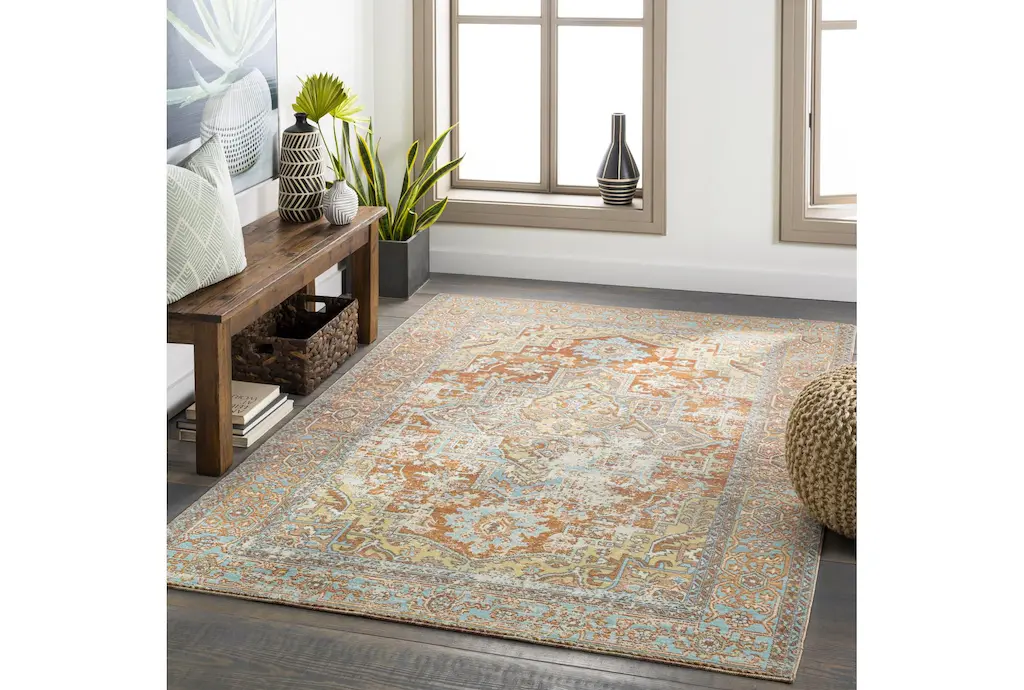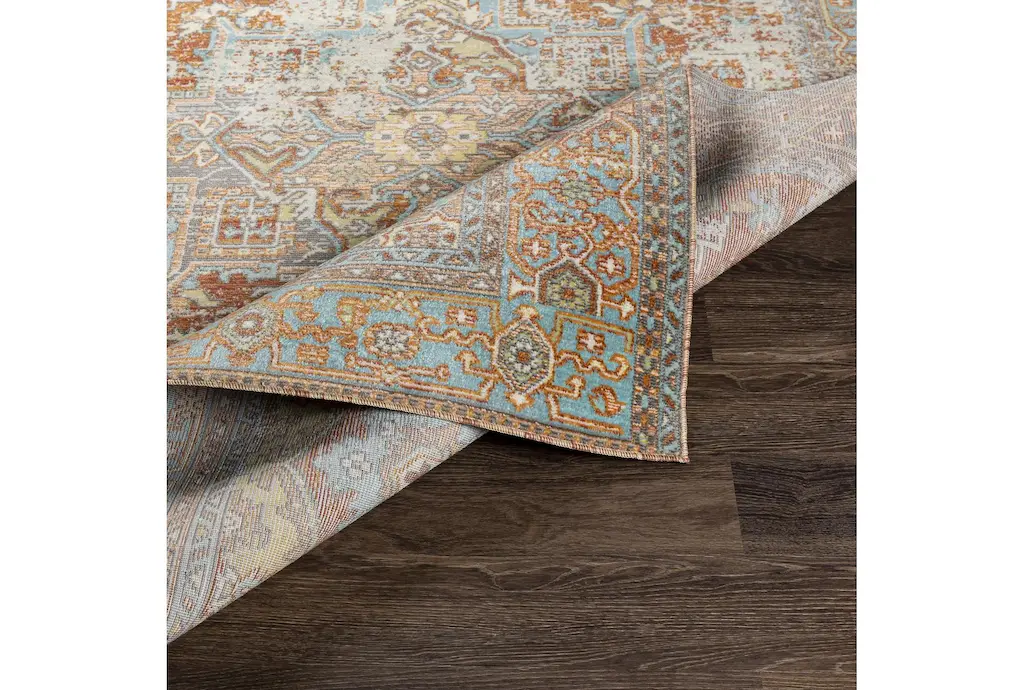 Enhance your living space with the 7'X9' Rectangle Indoor/Outdoor Fiber Rug in Ivory & Orange Oriental Border by Surya. This traditional style rug features a stunning array of colors including burnt orange, saffron, silver grey, medium grey, aqua, camel, and pale blue. Perfect for both indoor and outdoor use, it brings warmth and sophistication to any area.
